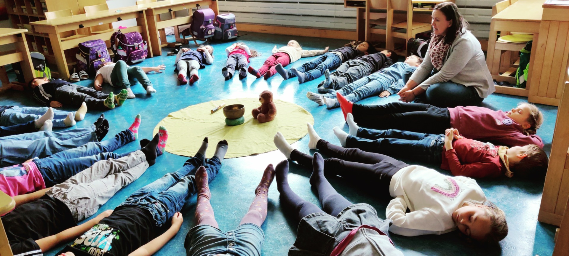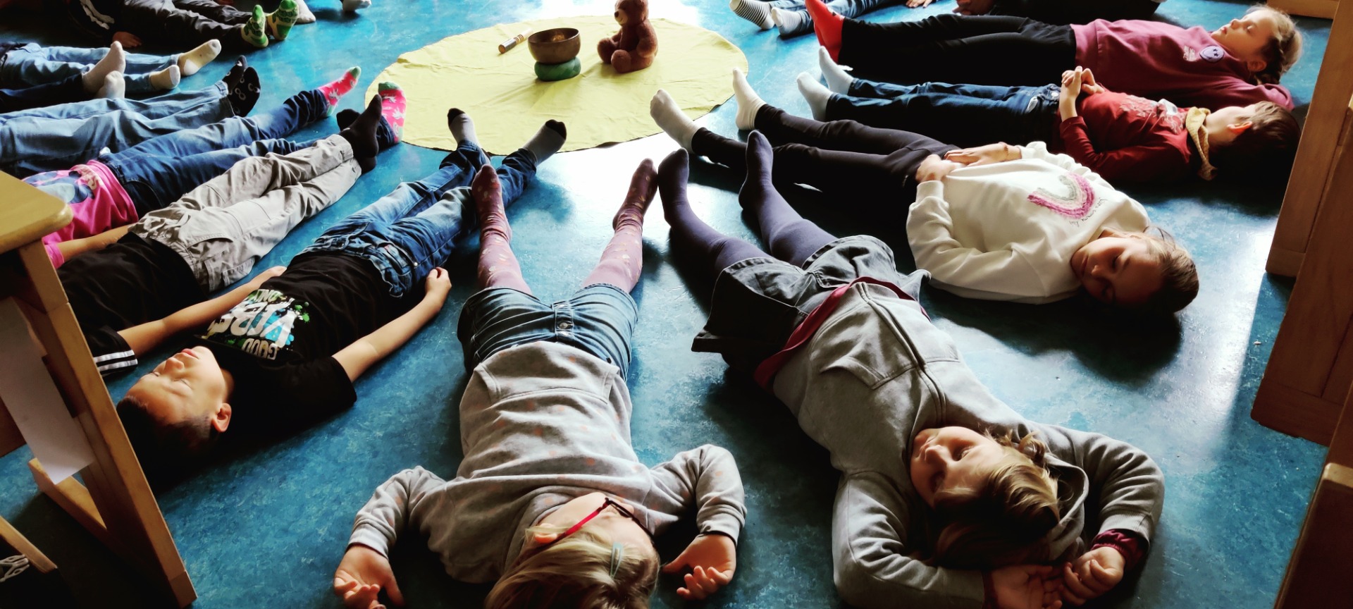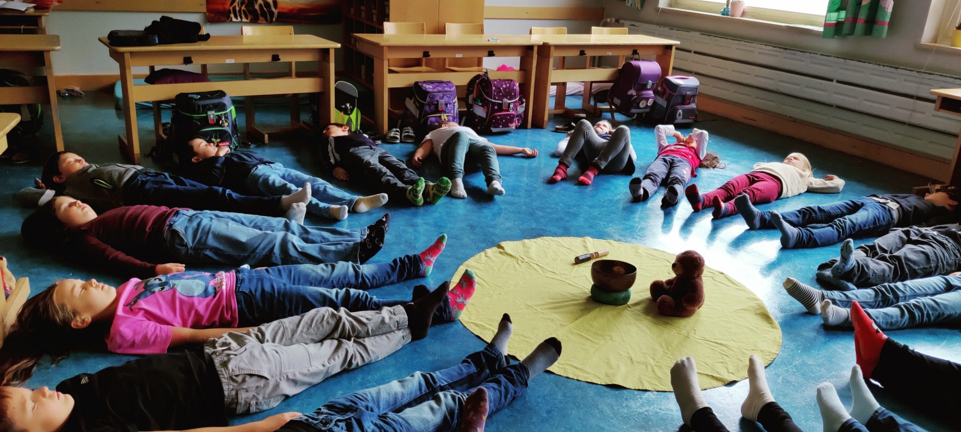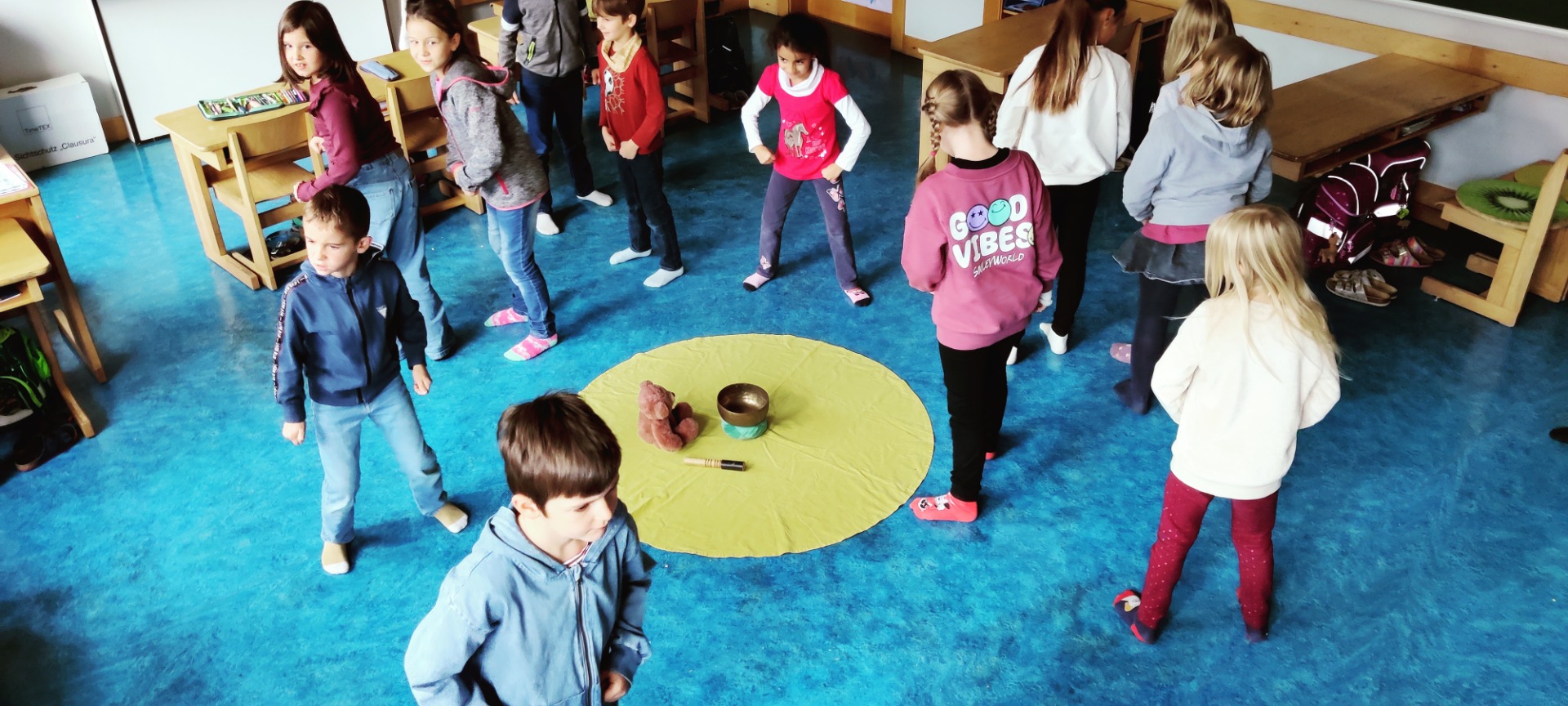 Jeden Montag freuen wir uns auf die Trainingsstunde mit Sonja Straßer. Auf den Fotos sieht man uns bei einer Meditation, die zu jeder Einheit dazugehört. Wir lernen aber auch sicher zu stehen, in Balance zu bleiben, stark und fürsorglich zu sein wie ein Bär, gut und respektvoll mit uns und den anderen umzugehen, aber auch „Stopp“ zu sagen und zu zeigen, wenn wir etwas nicht wollen. Wir freuen uns auf weitere interessante Einheiten, es gibt noch viel Neues zu lernen.