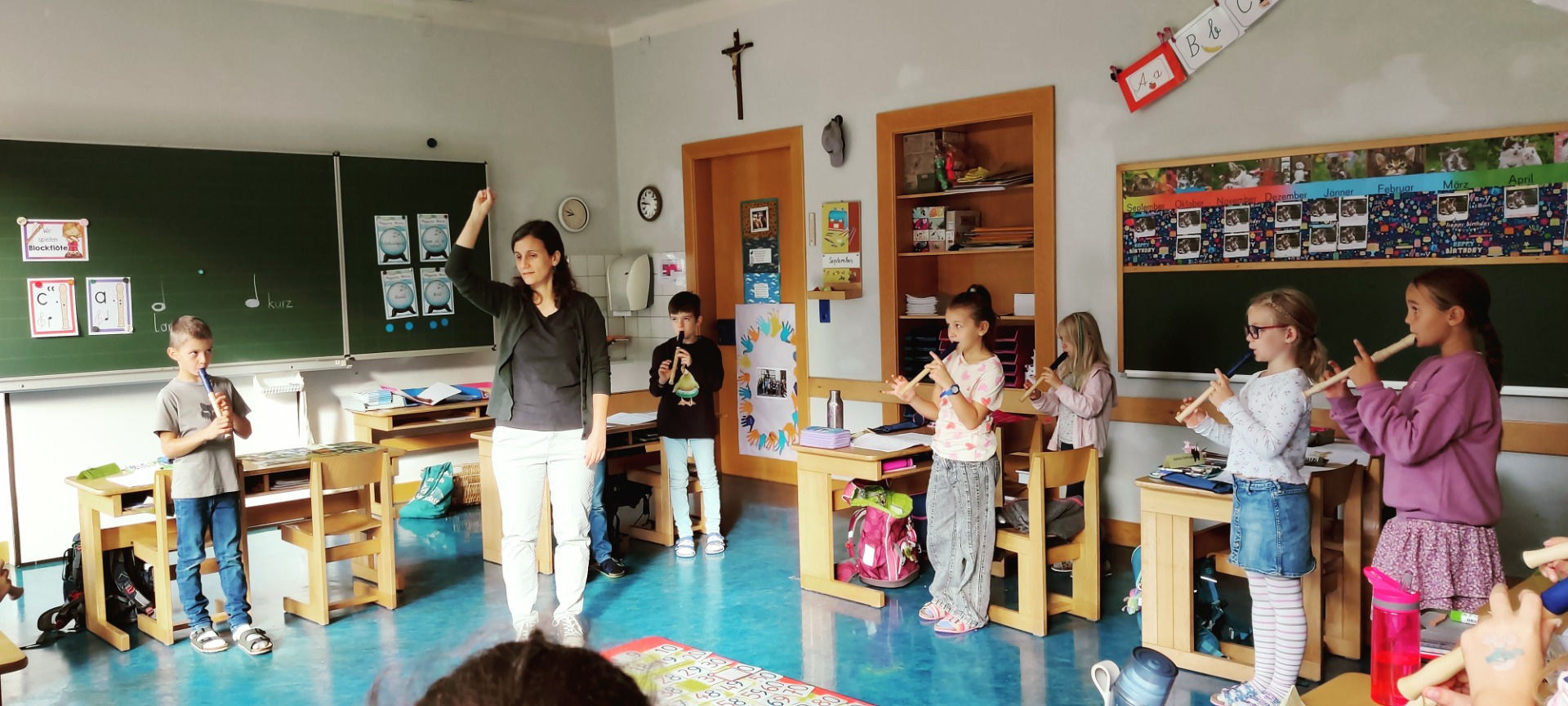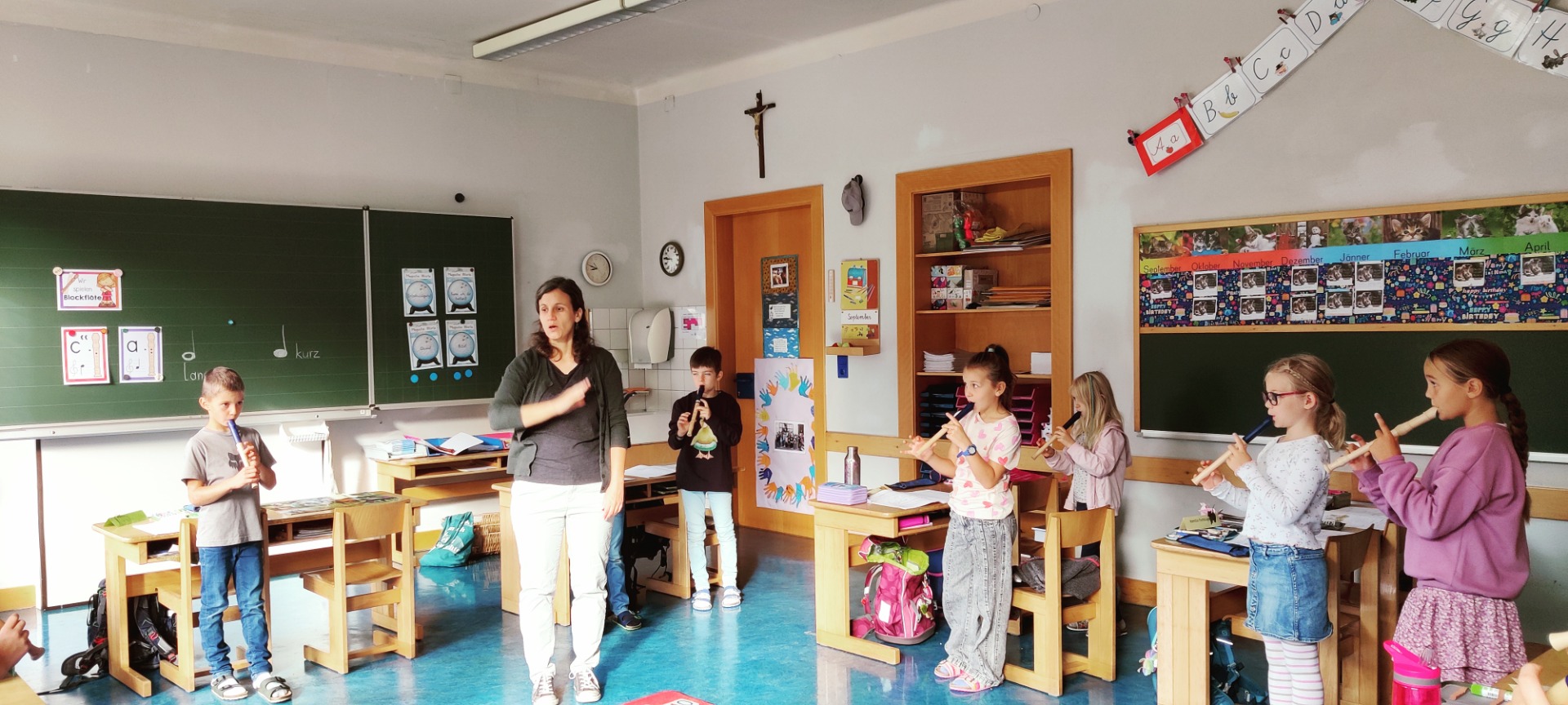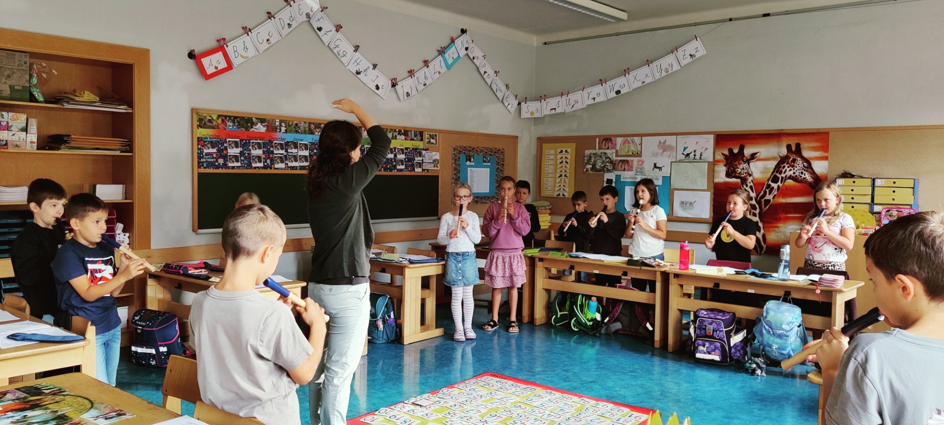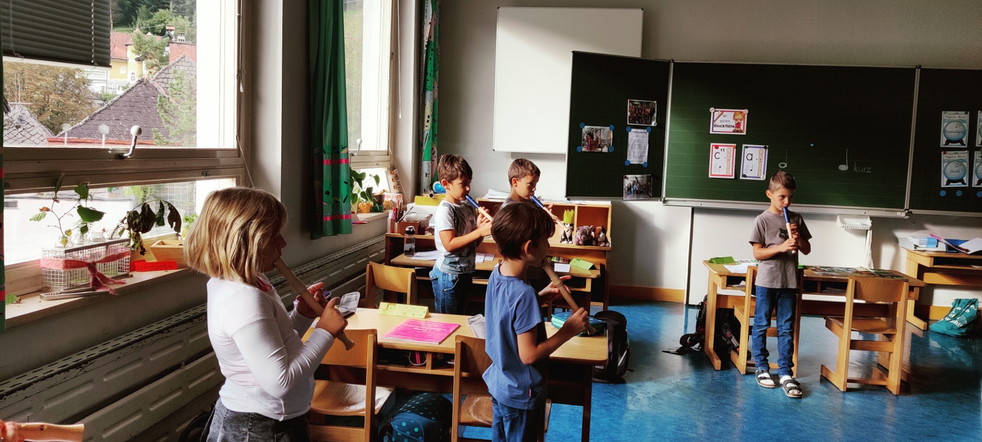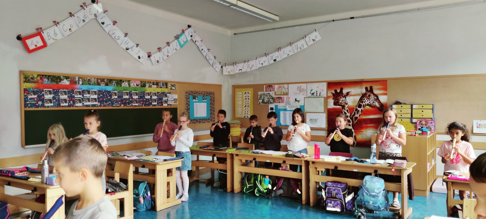 Das Flötespielen ist heuer neu in der 2. Klasse. Wir spielen jeden Tag in der Klasse miteinander, besonders interessant sind die Flötenstunden am Donnerstag. Unserer Flötenlehrerin Kerstin Picker erklärt uns die neuen Noten und spielt mit uns erste Lieder.