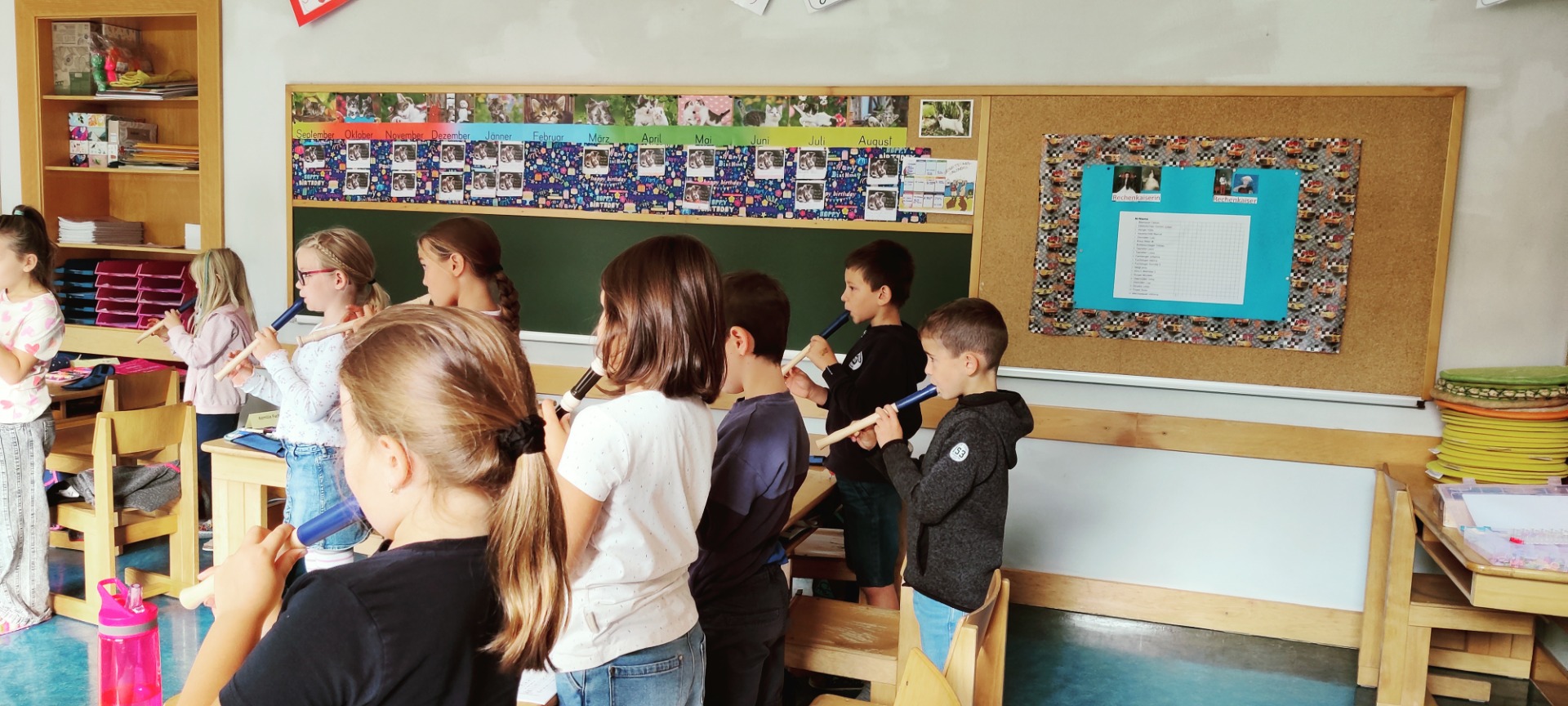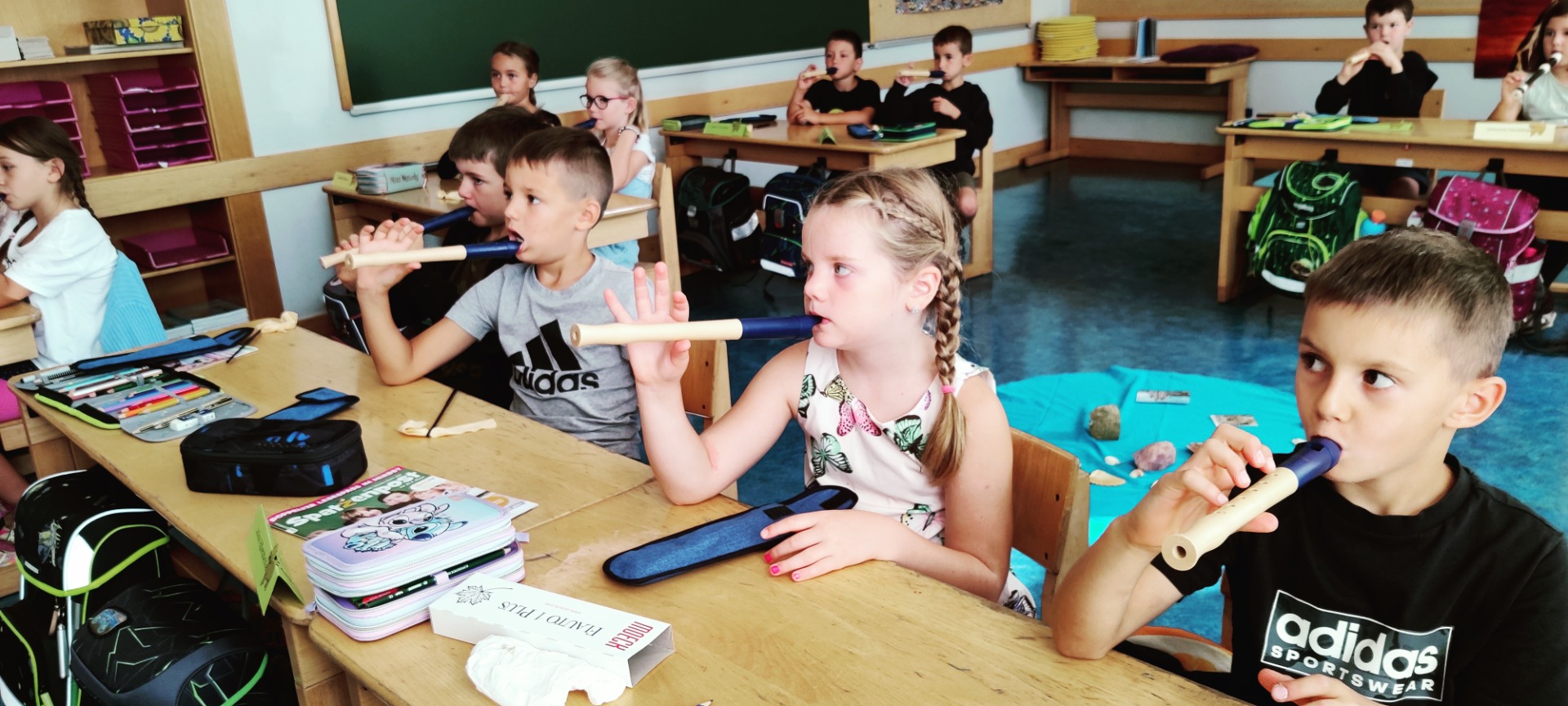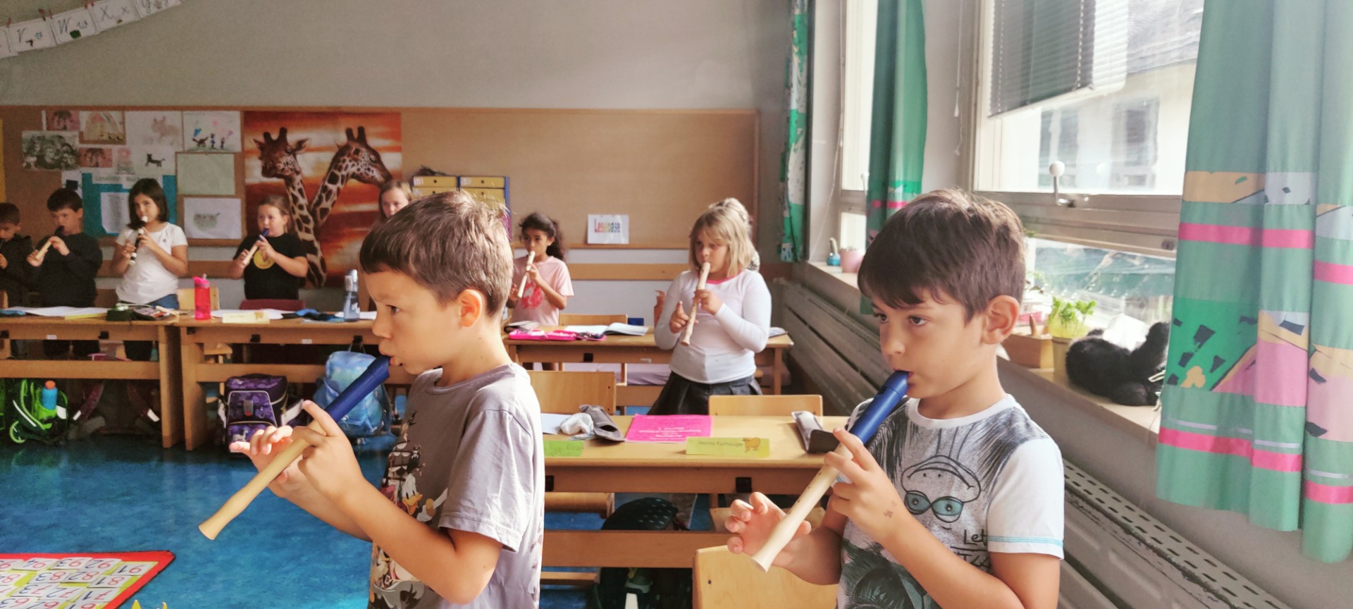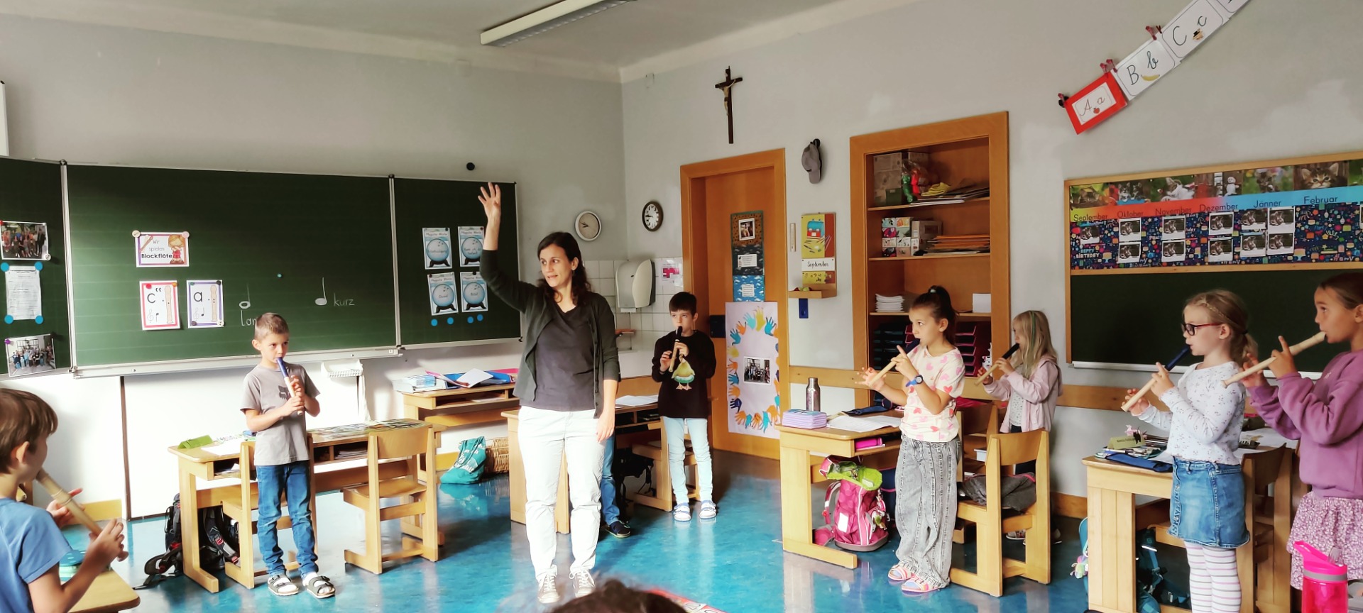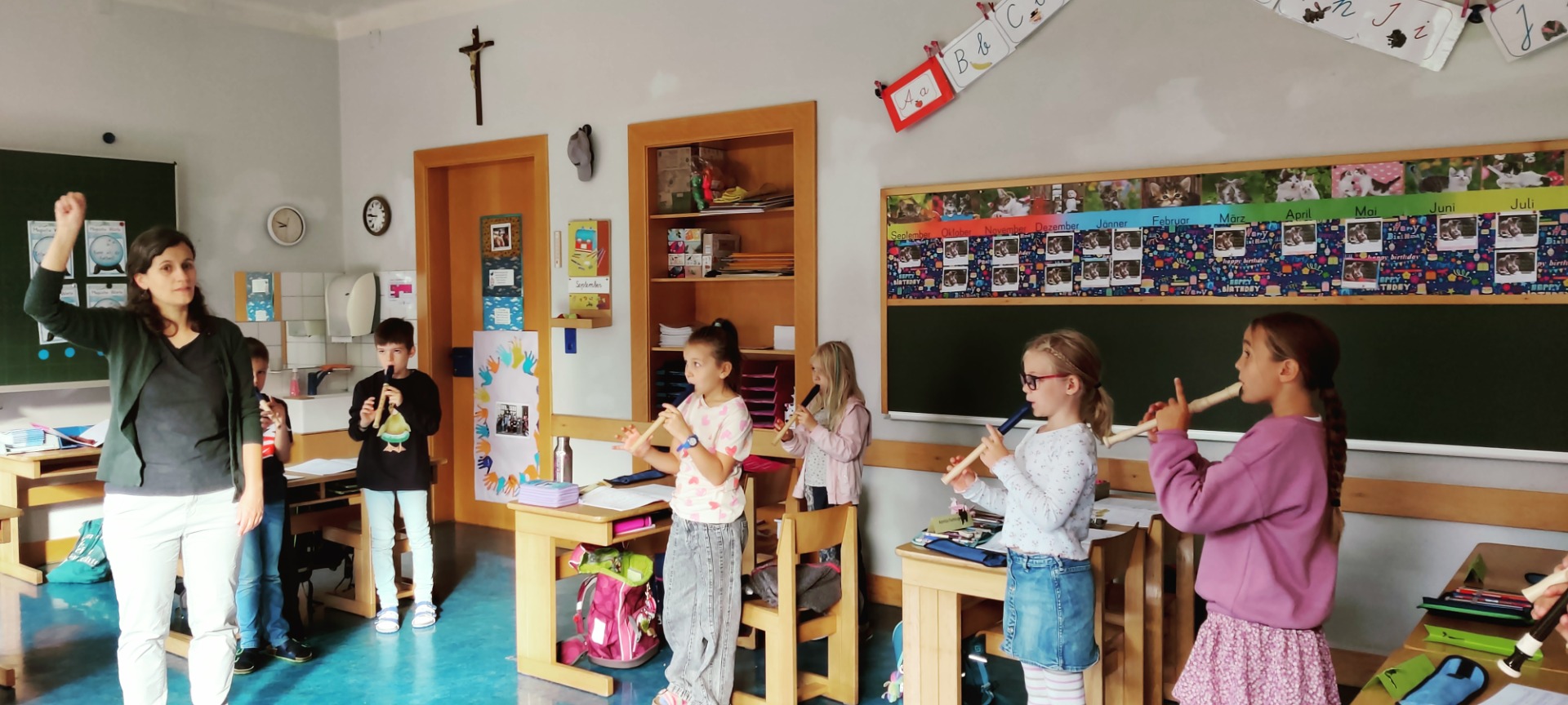 Das Flötespielen ist heuer neu in der 2. Klasse. Wir spielen jeden Tag in der Klasse miteinander, besonders interessant sind die Flötenstunden am Donnerstag. Unserer Flötenlehrerin Kerstin Picker erklärt uns die neuen Noten und spielt mit uns erste Lieder.