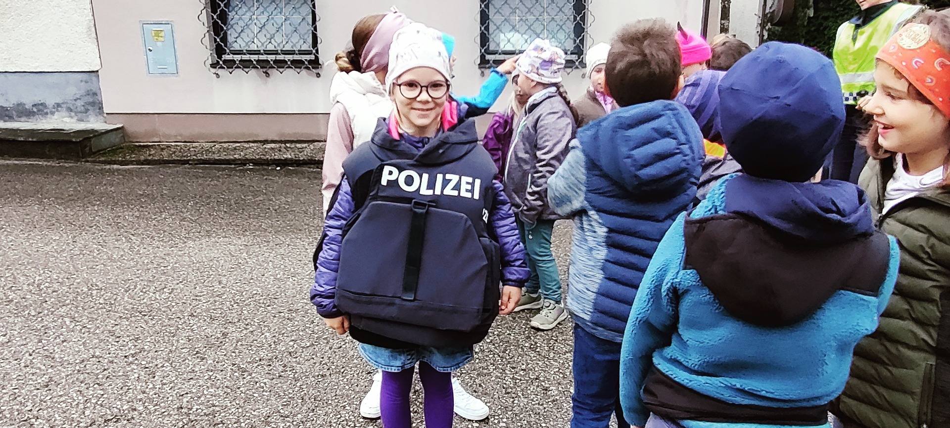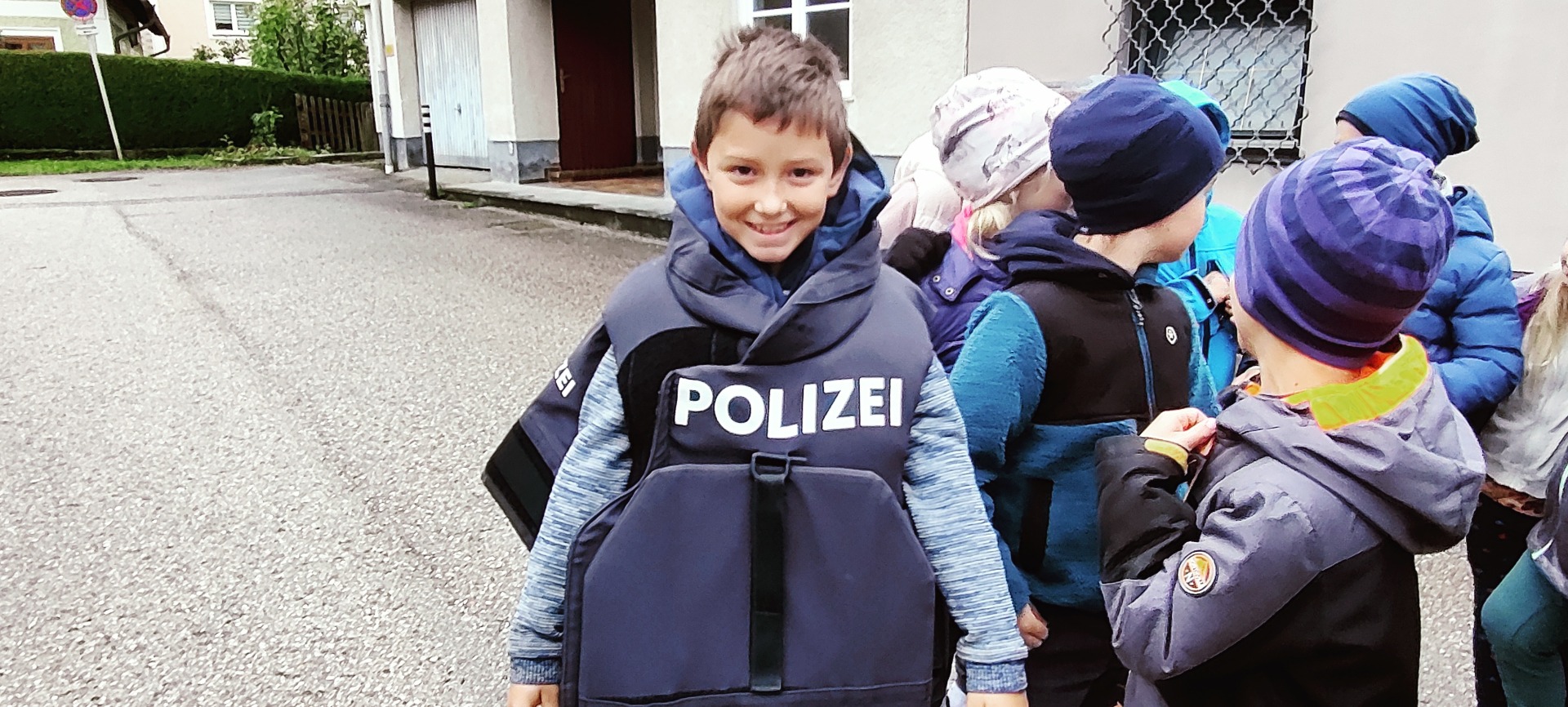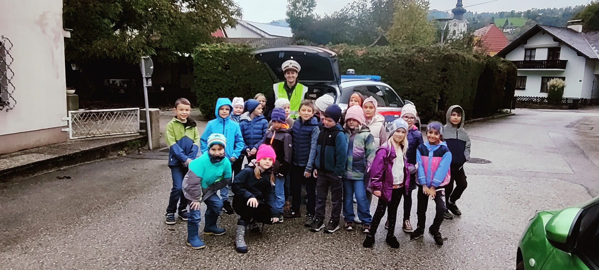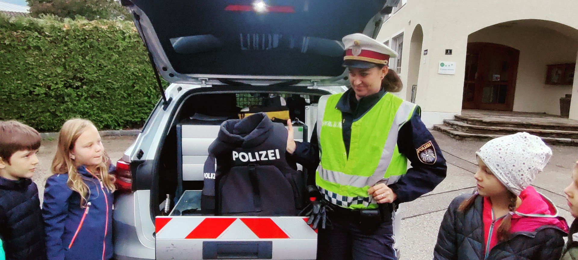 Auch in der 2. Klasse besuchte uns die Polizistin und ging mit uns den Schulweg ab. Wir lernten auch an schwierigen Stellen die Straße sicher zu überqueren. Alle Kinder konnten das Gelernte gut im Straßenverkehr umsetzen. Beim Planieren des Parkplatzes machten wir auch einen kurzen Halt, um die besonderen Fahrzeuge zu bewundern. Das Tollste kommt aber meistens zum Schluss. Wir durften auch das Polizeiauto mit Blaulicht, den Defibrillator im Auto und die kugelsichere Weste sehen. Beim Anprobieren konnten wir fühlen, wie schwer diese besondere Schutzkleidung ist. Herzlichen Dank für diese großartige Einheit mit der Polizei.