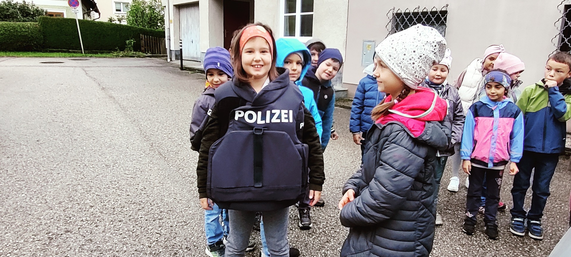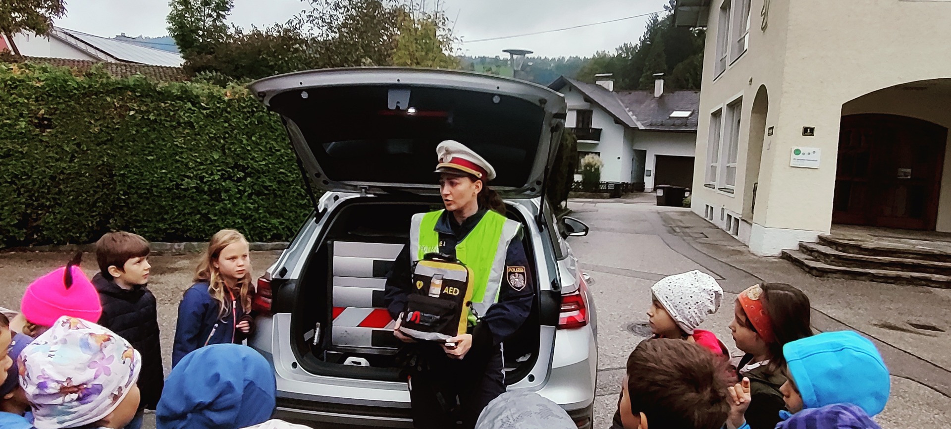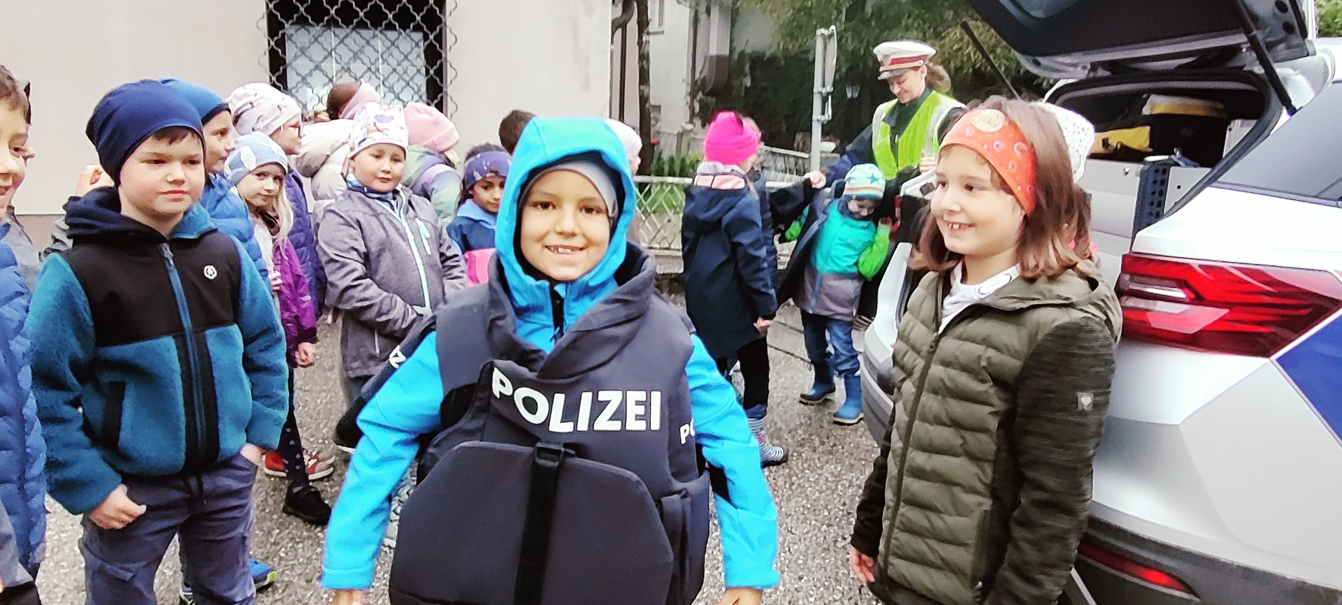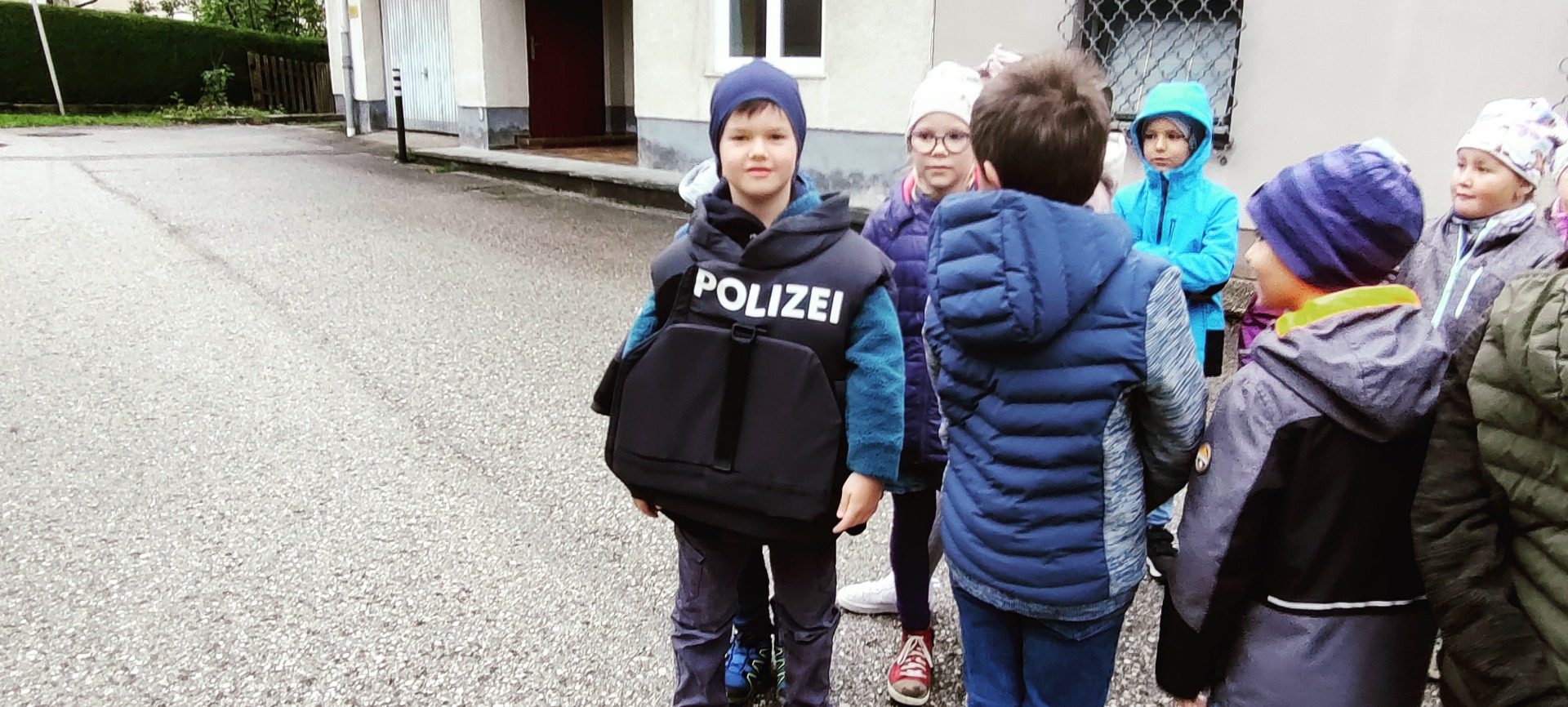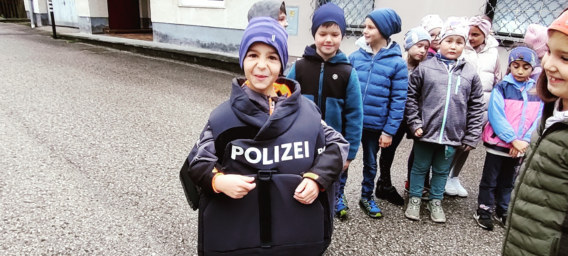 Auch in der 2. Klasse besuchte uns die Polizistin und ging mit uns den Schulweg ab. Wir lernten auch an schwierigen Stellen die Straße sicher zu überqueren. Alle Kinder konnten das Gelernte gut im Straßenverkehr umsetzen. Beim Planieren des Parkplatzes machten wir auch einen kurzen Halt, um die besonderen Fahrzeuge zu bewundern. Das Tollste kommt aber meistens zum Schluss. Wir durften auch das Polizeiauto mit Blaulicht, den Defibrillator im Auto und die kugelsichere Weste sehen. Beim Anprobieren konnten wir fühlen, wie schwer diese besondere Schutzkleidung ist. Herzlichen Dank für diese großartige Einheit mit der Polizei.