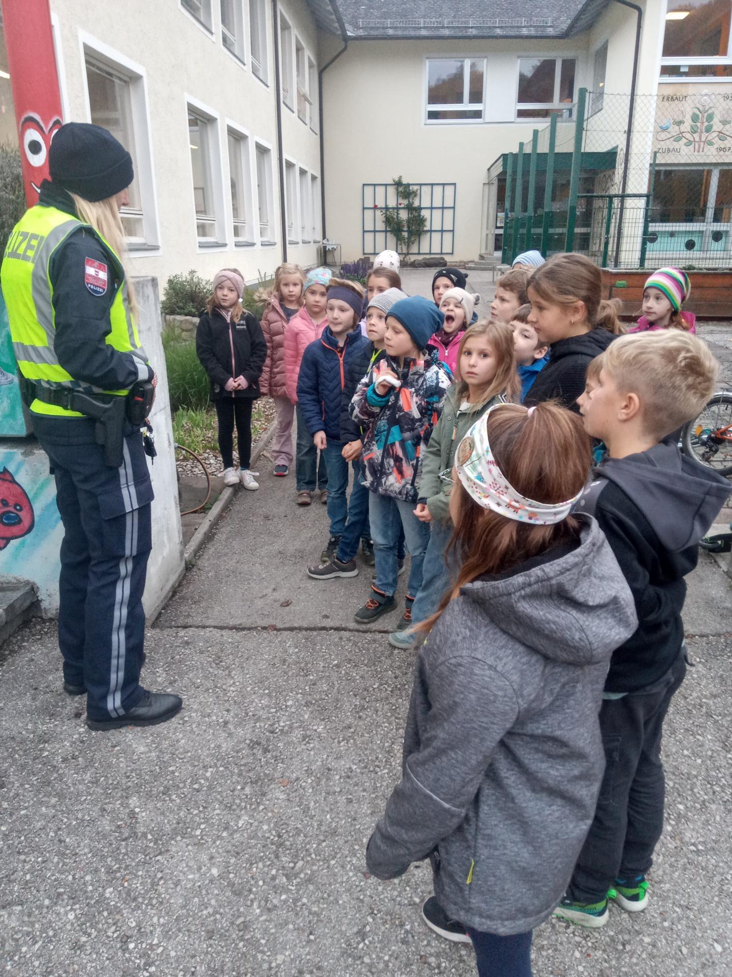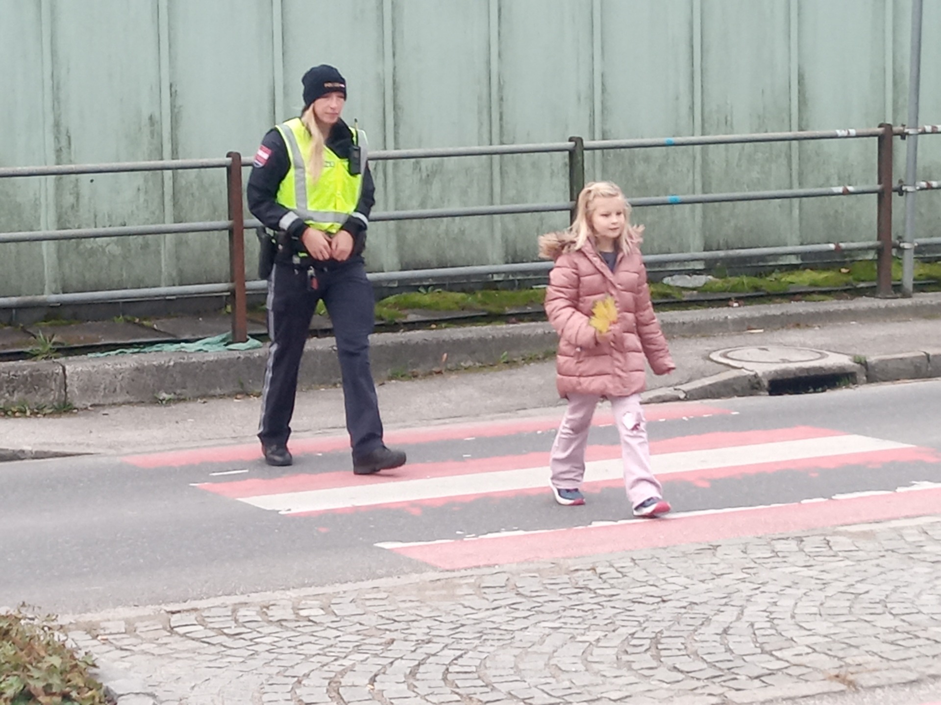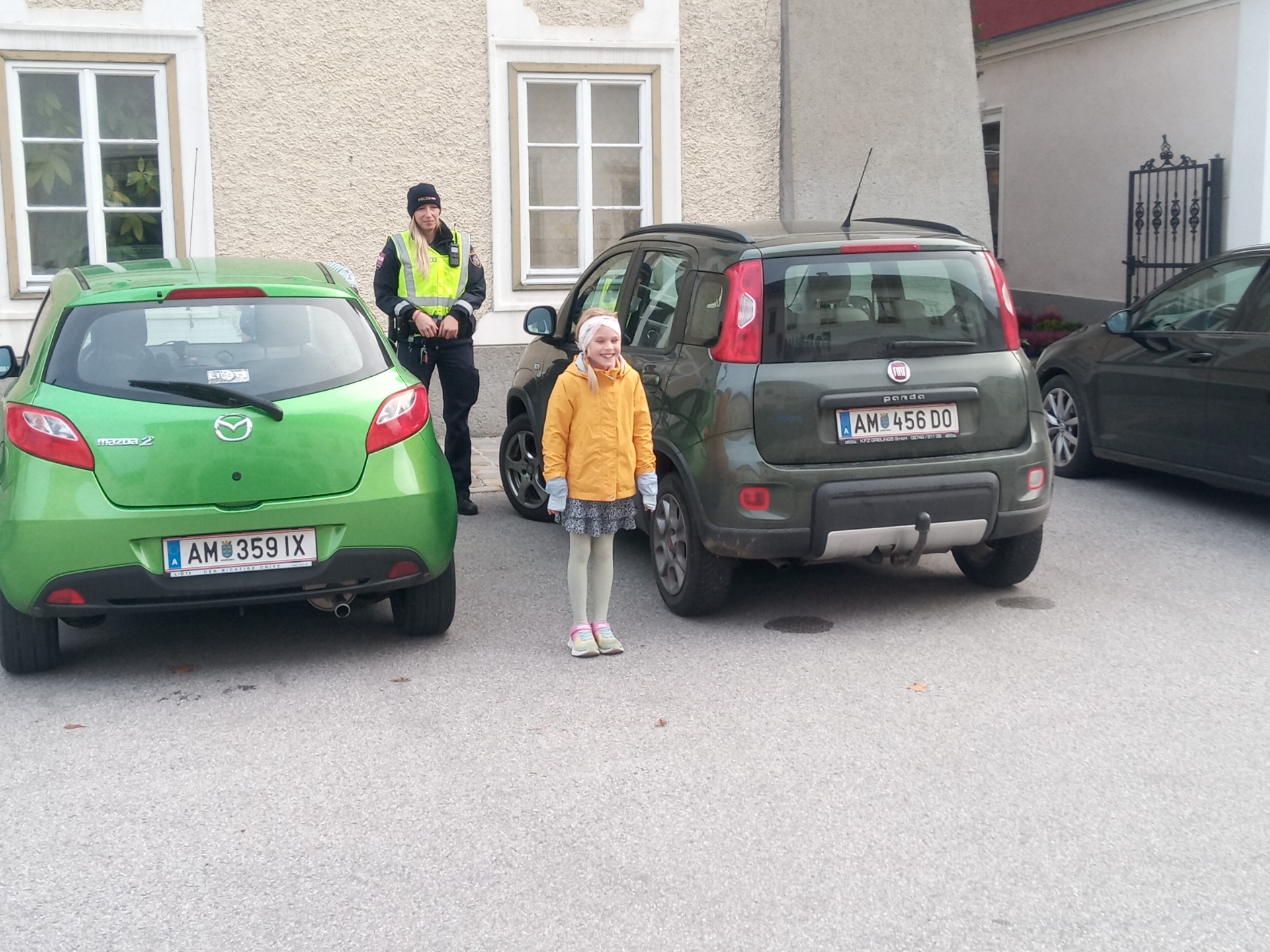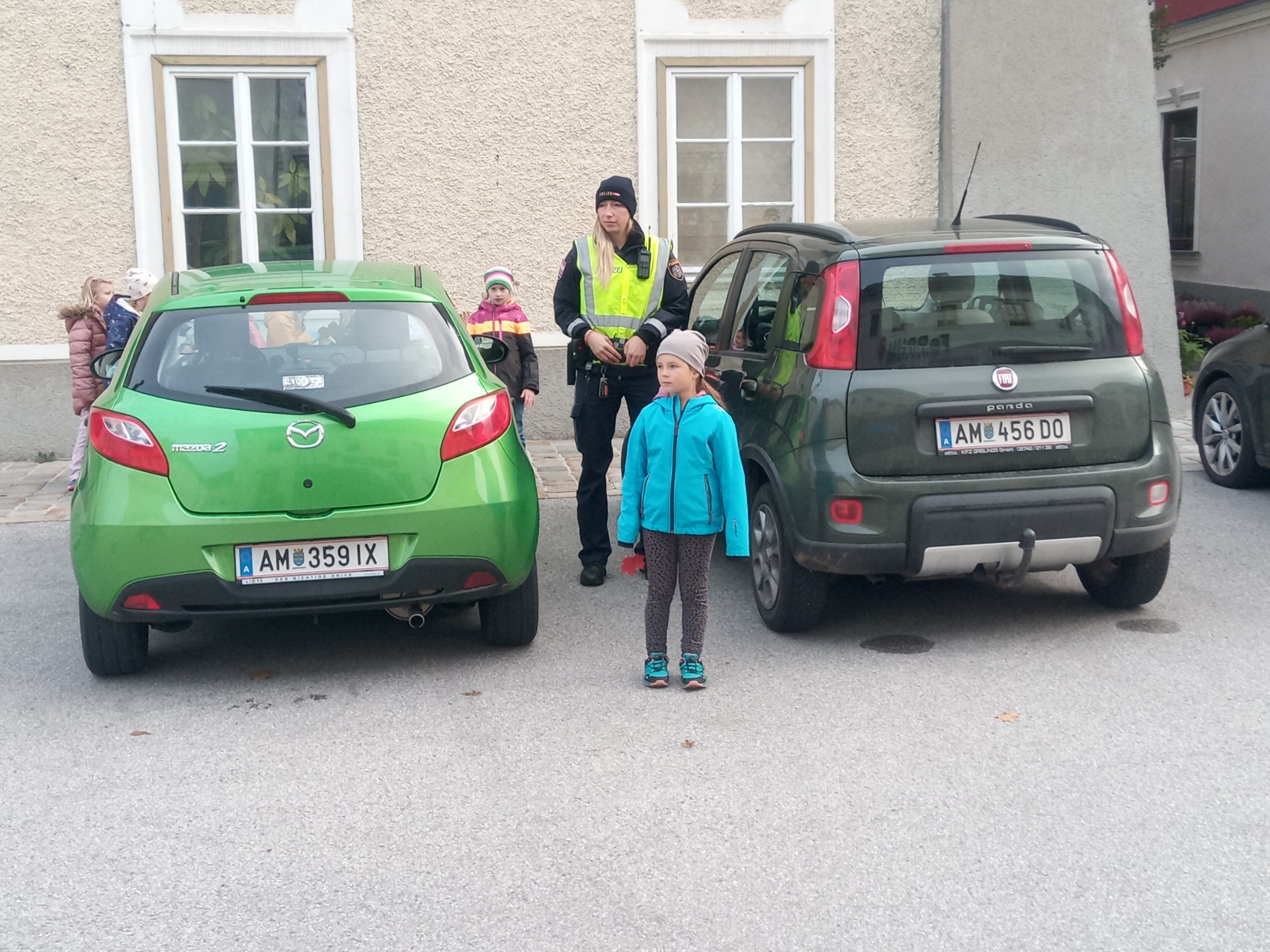 Am 14. Oktober besuchte uns eine Polizistin aus Waidhofen, um mit uns das sichere Überqueren der Straße zu üben. Dazu suchte sie für uns gleich die Bundesstraße als Übungsort aus. Anschließend übten wir noch das richtige Überqueren zwischen 2 Autos.