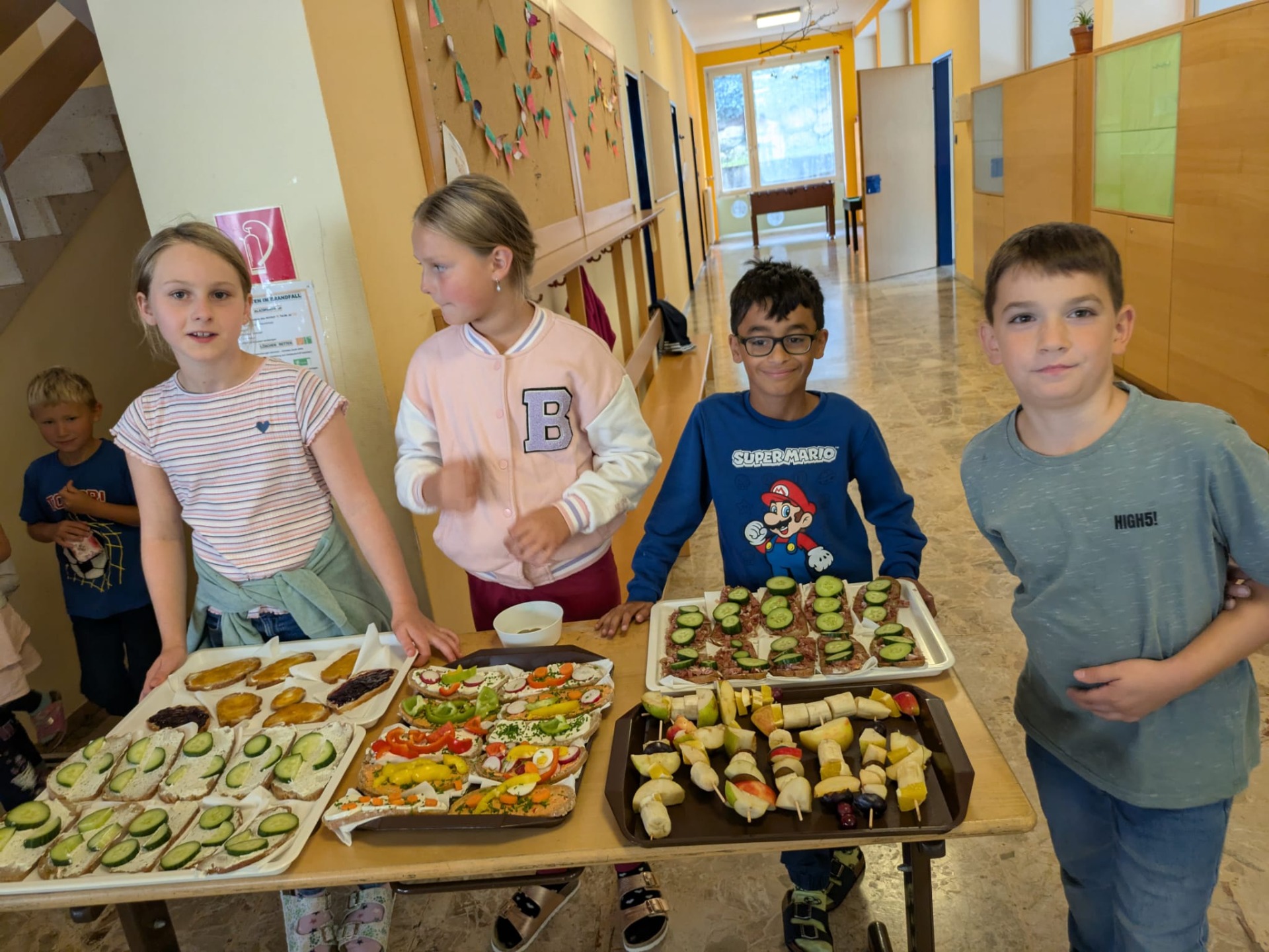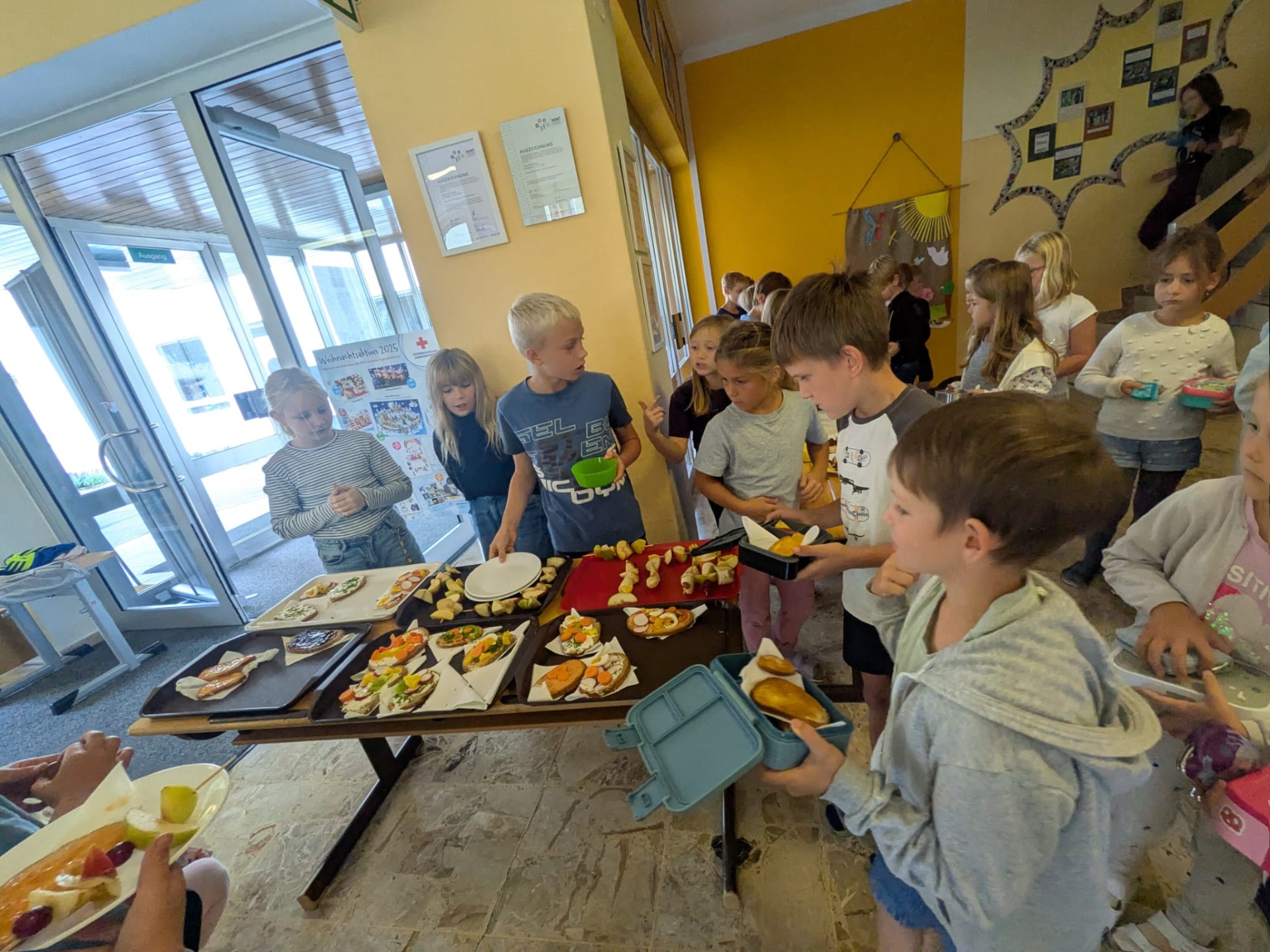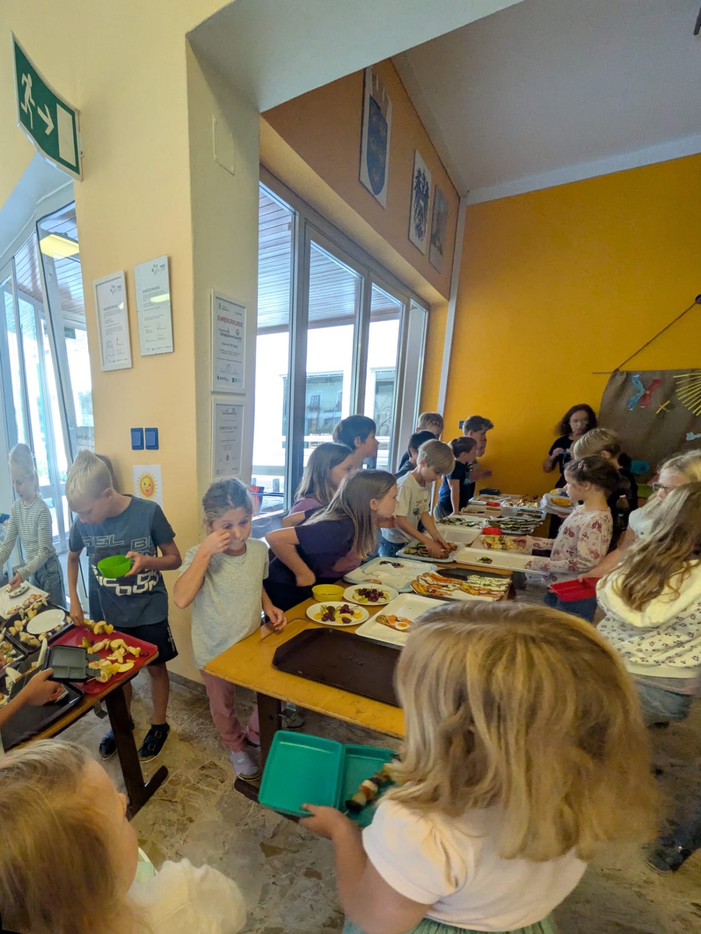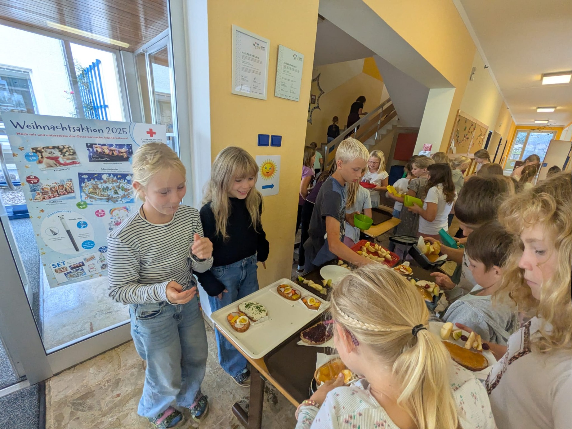 Jausenverkauf am 22. September 2025 Mit Freude, Geschick und Ausdauer bereiteten die Kinder der 4b köstliche Obstspieße, Aufstrichbrote, Speck- und Marmeladenbrote zu. Danke an die Eltern für die guten Lebensmittelspenden und Irmi Reingruber für die Unterstützung.
