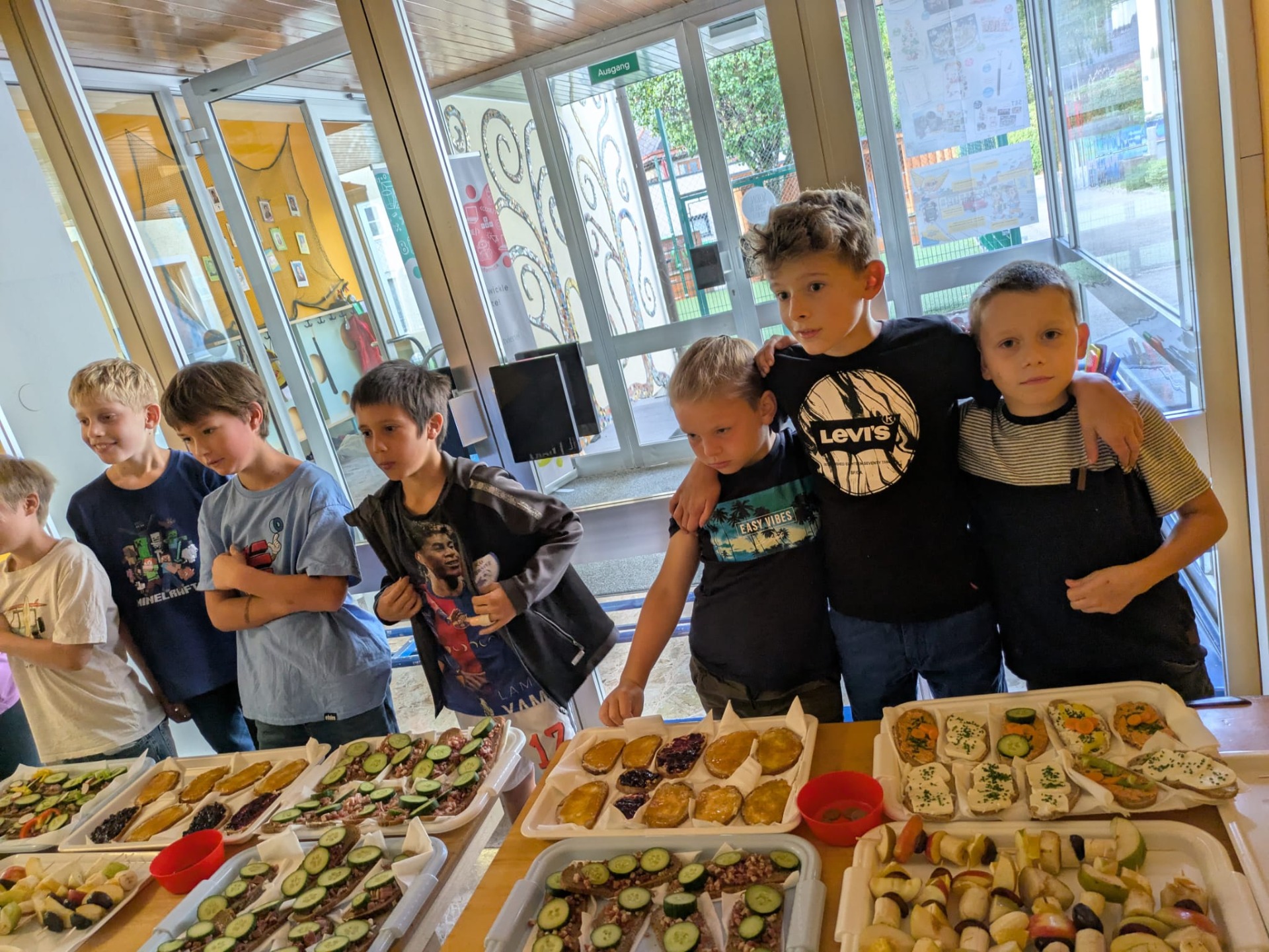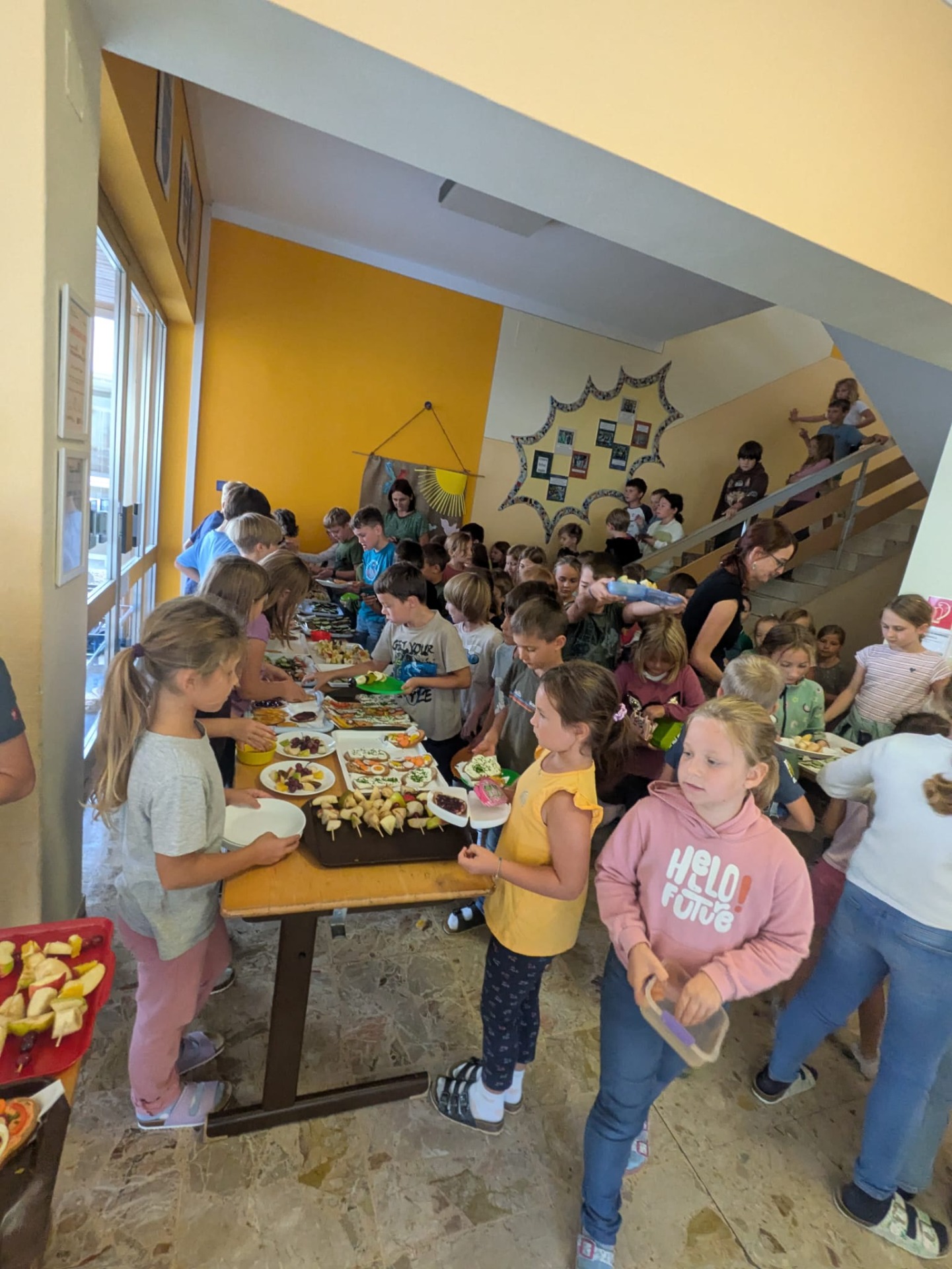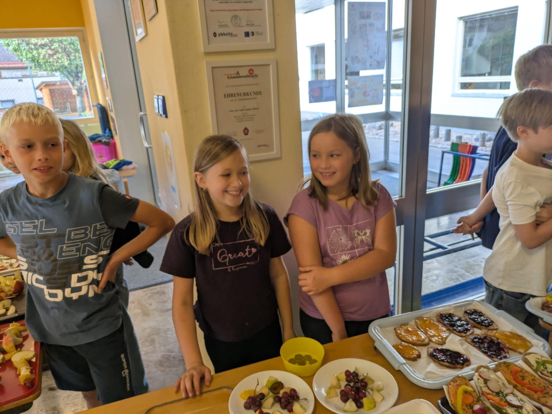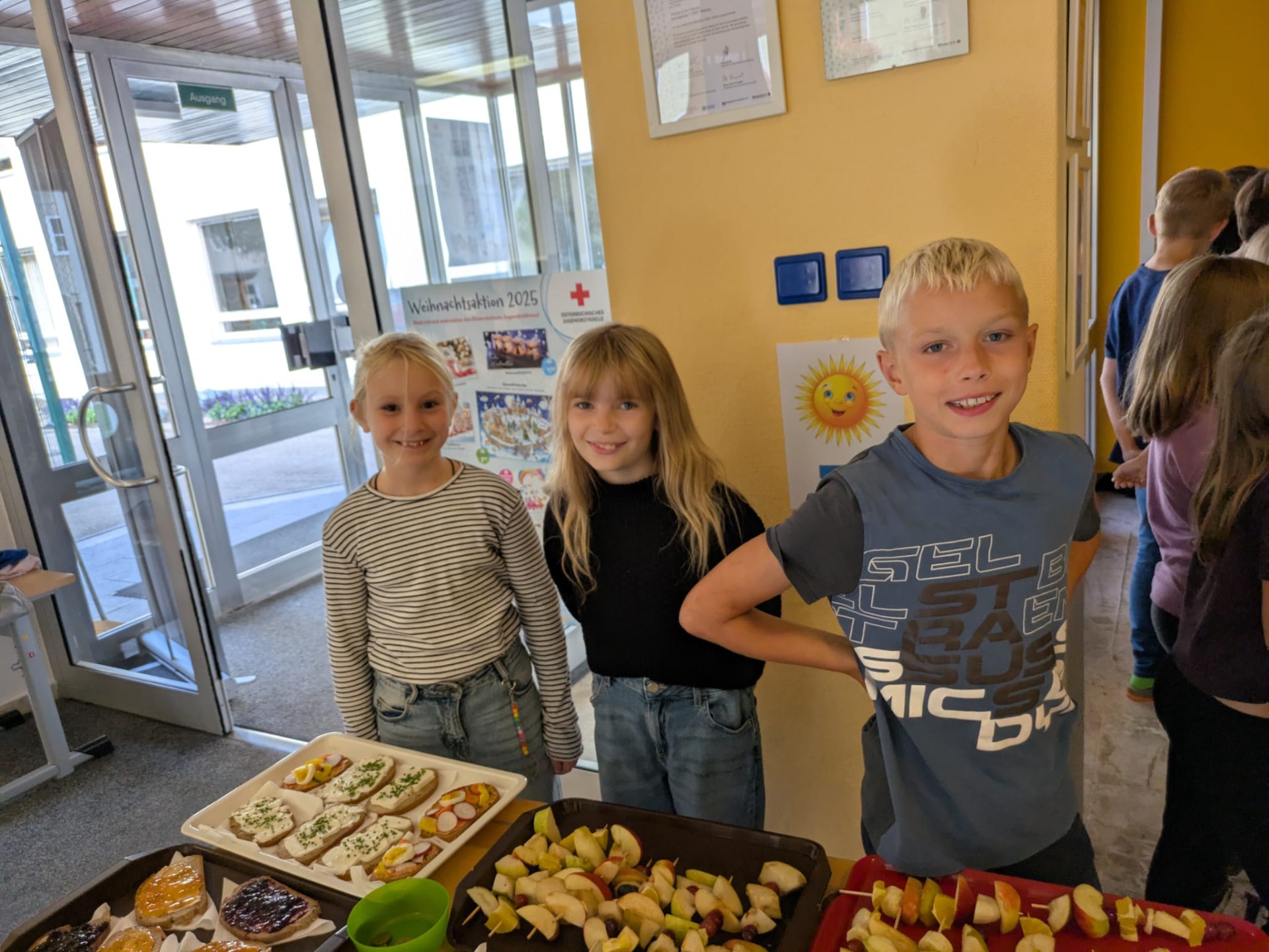 Jausenverkauf am 22. September 2025 Mit Freude, Geschick und Ausdauer bereiteten die Kinder der 4b köstliche Obstspieße, Aufstrichbrote, Speck- und Marmeladenbrote zu. Danke an die Eltern für die guten Lebensmittelspenden und Irmi Reingruber für die Unterstützung.