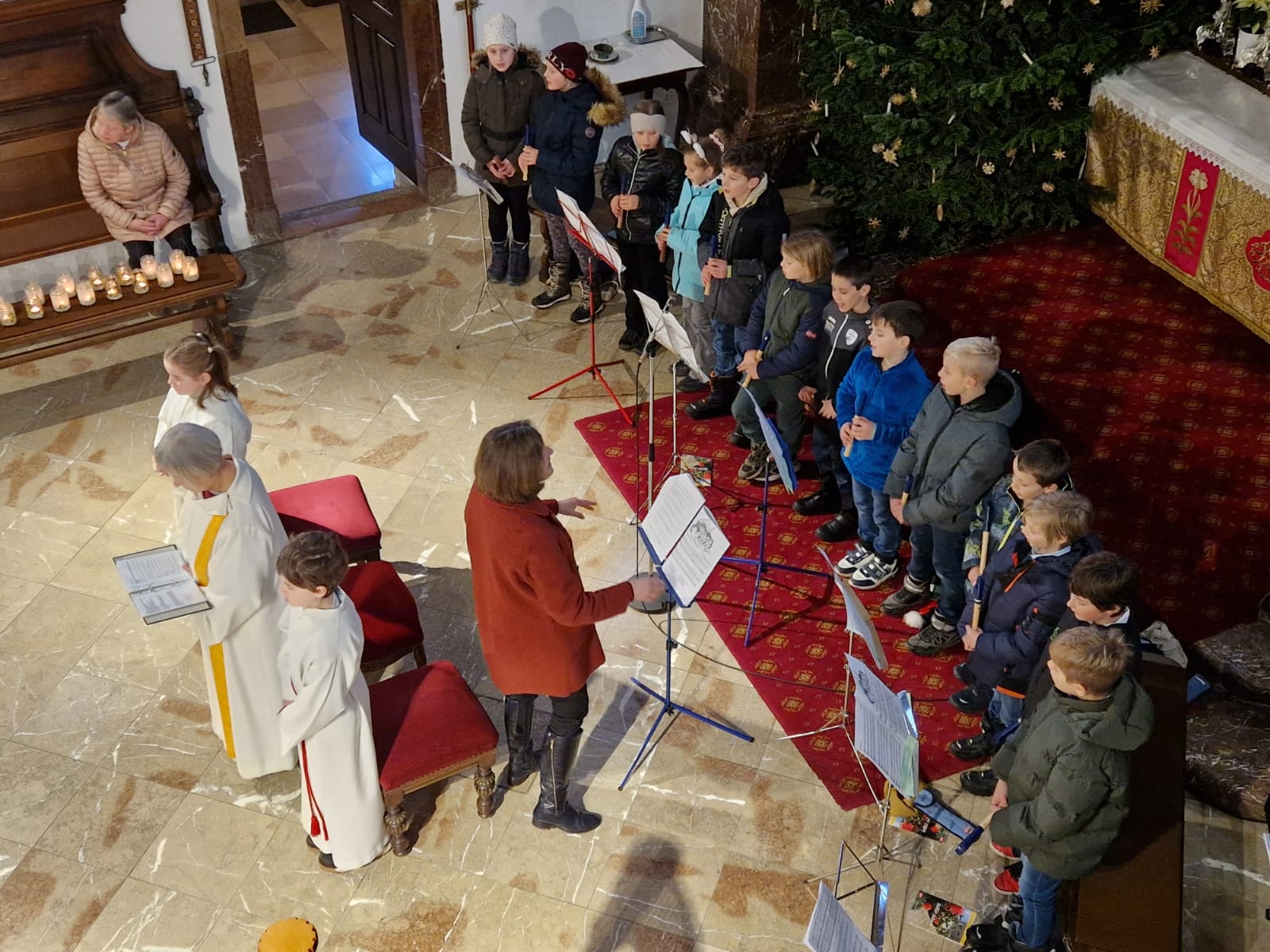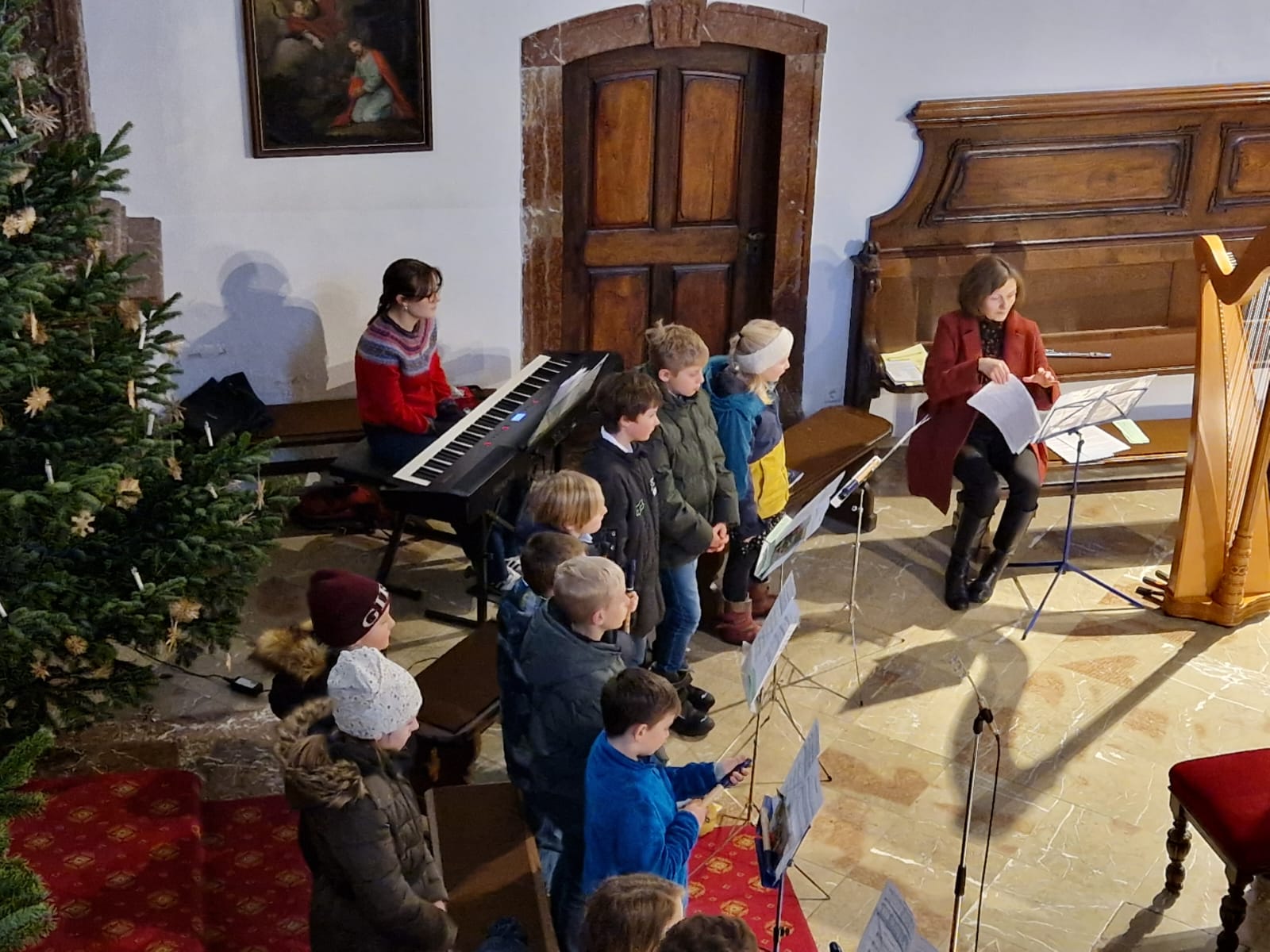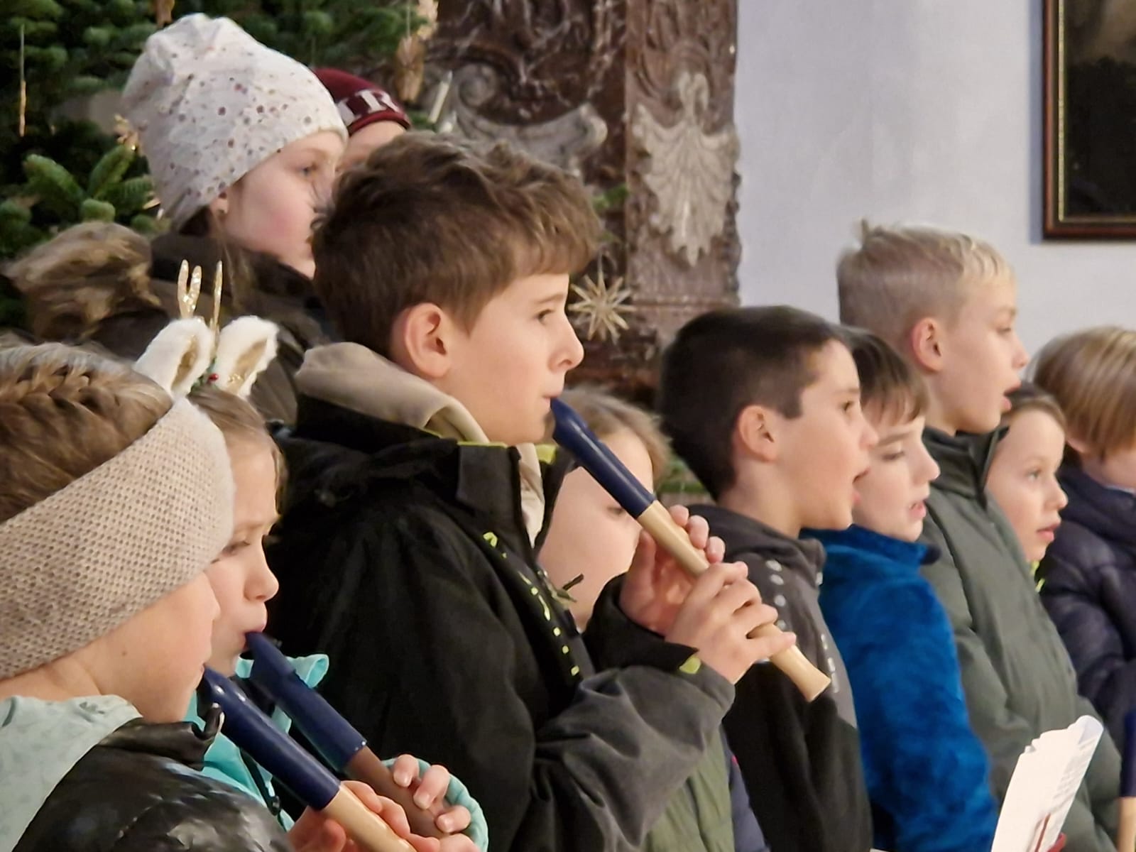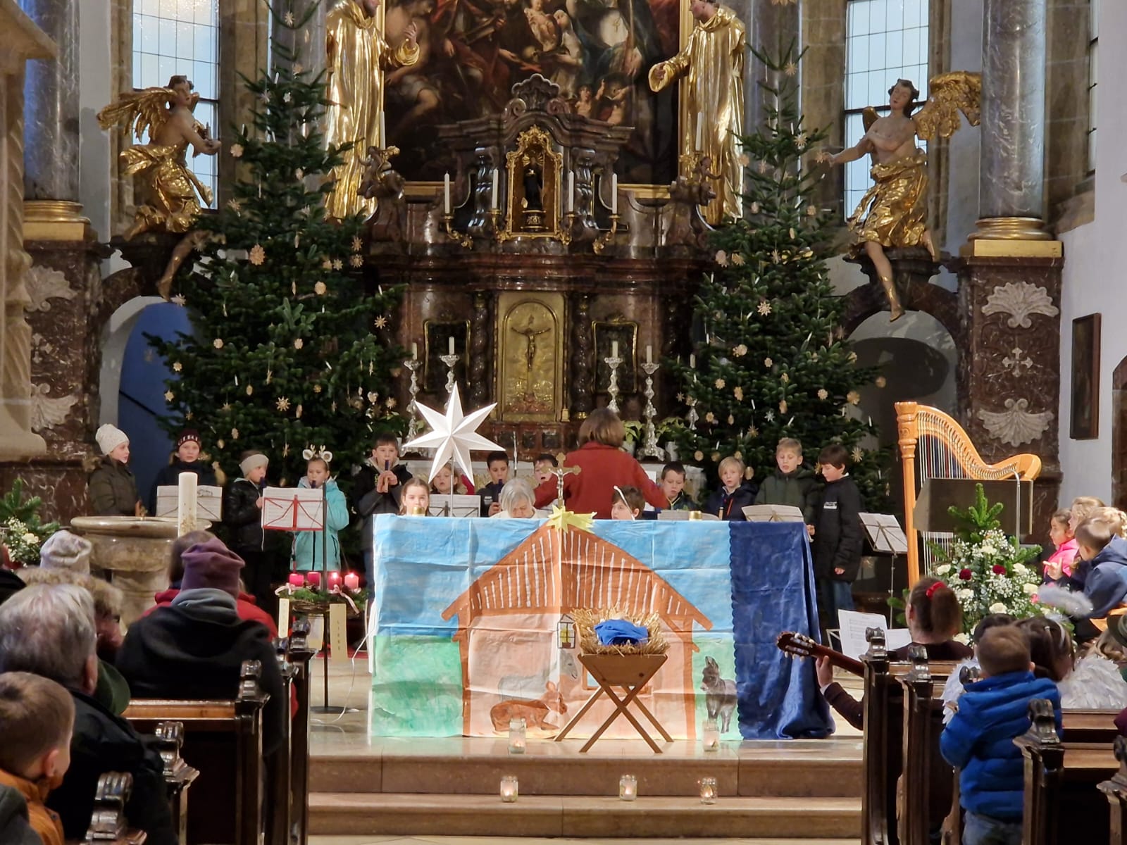 Kinderweihnacht in der Pfarrkirche Mit Blockflöten, Harfe, Klavier, Gesang und Lesetexten gestalteten die Schüler der 4b die Kinderweihnacht feierlich mit.