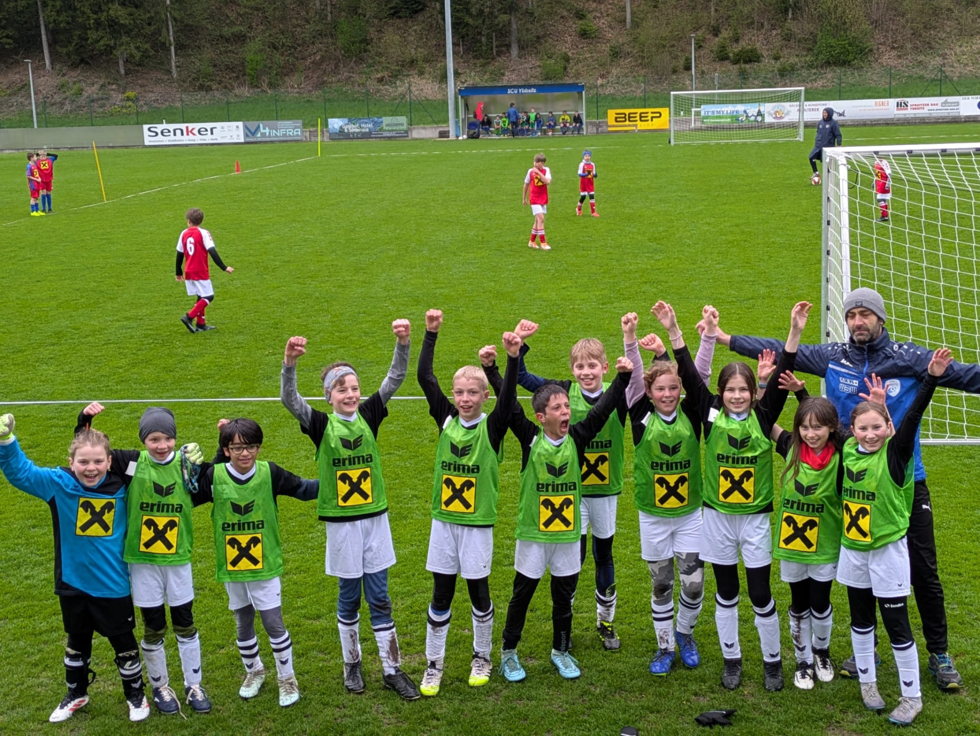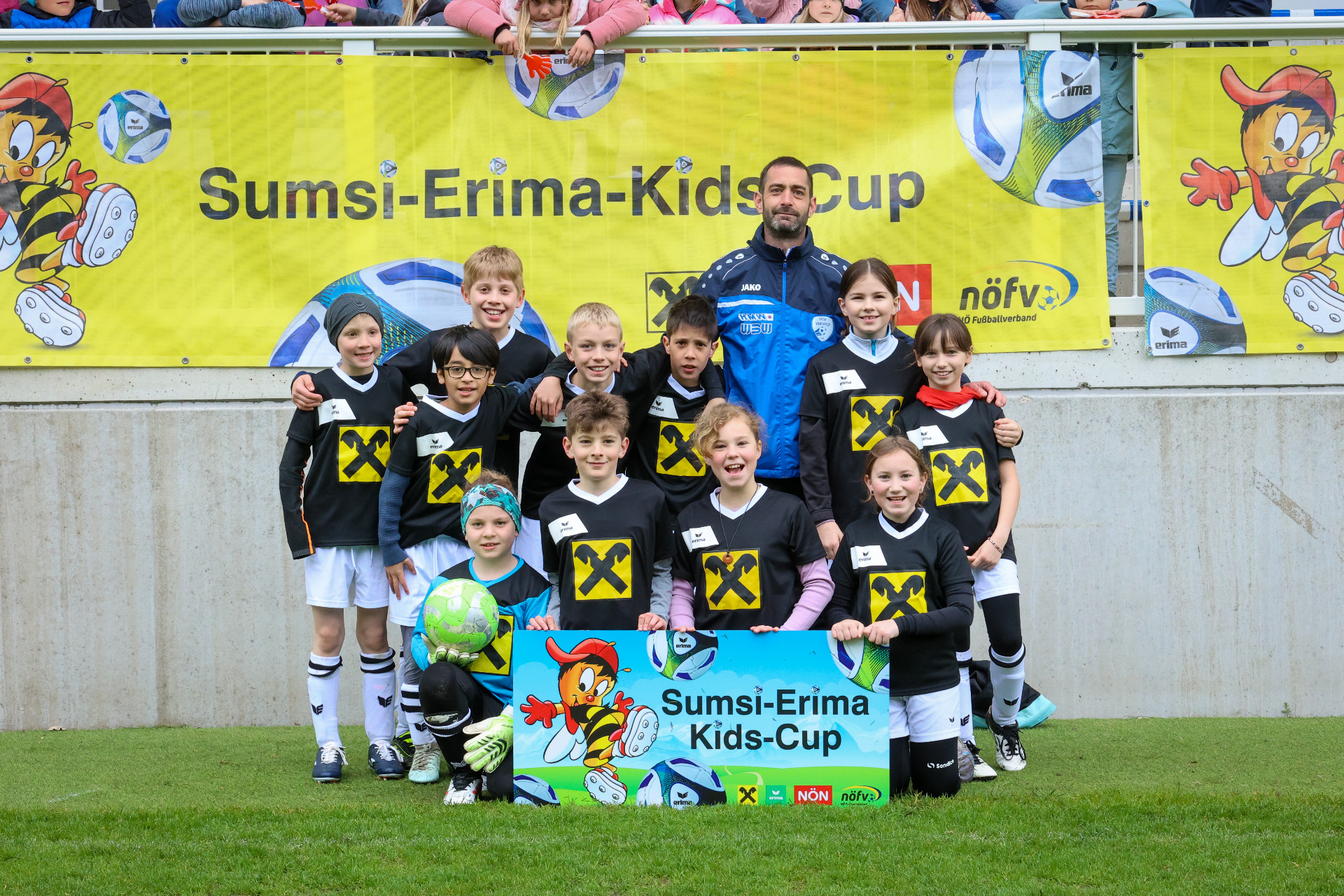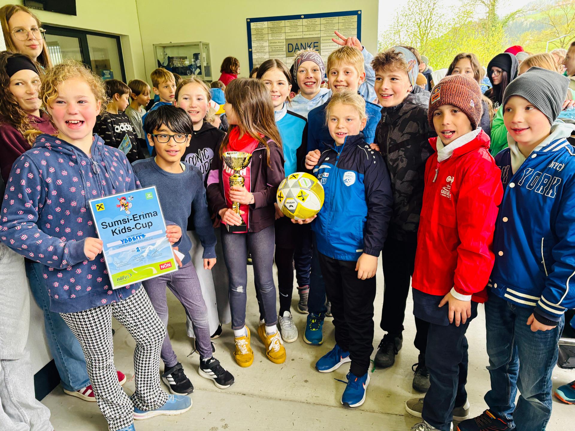 Sechs verschiedene Mannschaften aus den Nachbarorten nahmen an dem spannenden Fußballturnier, Sumsi Erima Kids-Cup, in der Ybbsitzer HMW – Arena teil. Unsere vierten Klassen wurden von einer starken Mannschaft aus beiden Klassen vertreten. Fußballtrainer Alexander Korntheuer hatte im Vorfeld das Team mit Trainingseinheiten sehr gut vorbereitet. Die Mannschaft (insgesamt kamen alle 11 nominierten Spieler, davon 4 Mädchen, zum Einsatz) kämpfte mit voller Kraft, gutem Teamgeist und Fairness. Die Mitschüler und auch Eltern feuerten unsere Mannschaft kräftig an und so erreichte Ybbsitz den tollen 2. Platz hinter der Volksschule Zell und sicherte sich damit erneut den Aufstieg ins Regionalfinale, das dieses Jahr am 19. Mai ebenso am Fußballplatz in Ybbsitz über die Bühne gehen wird.