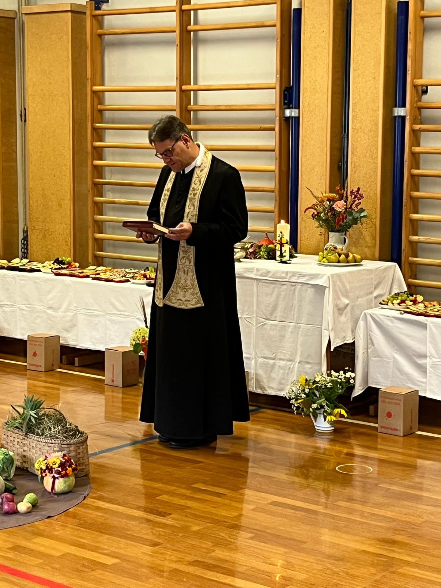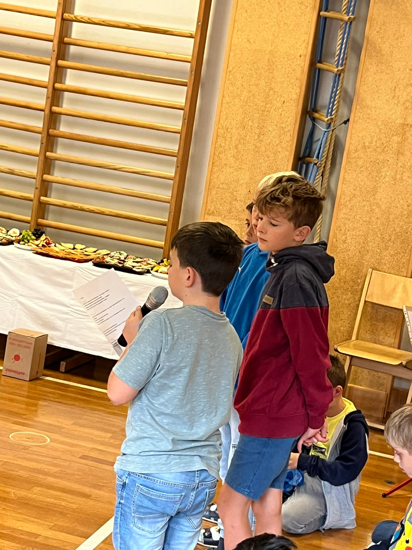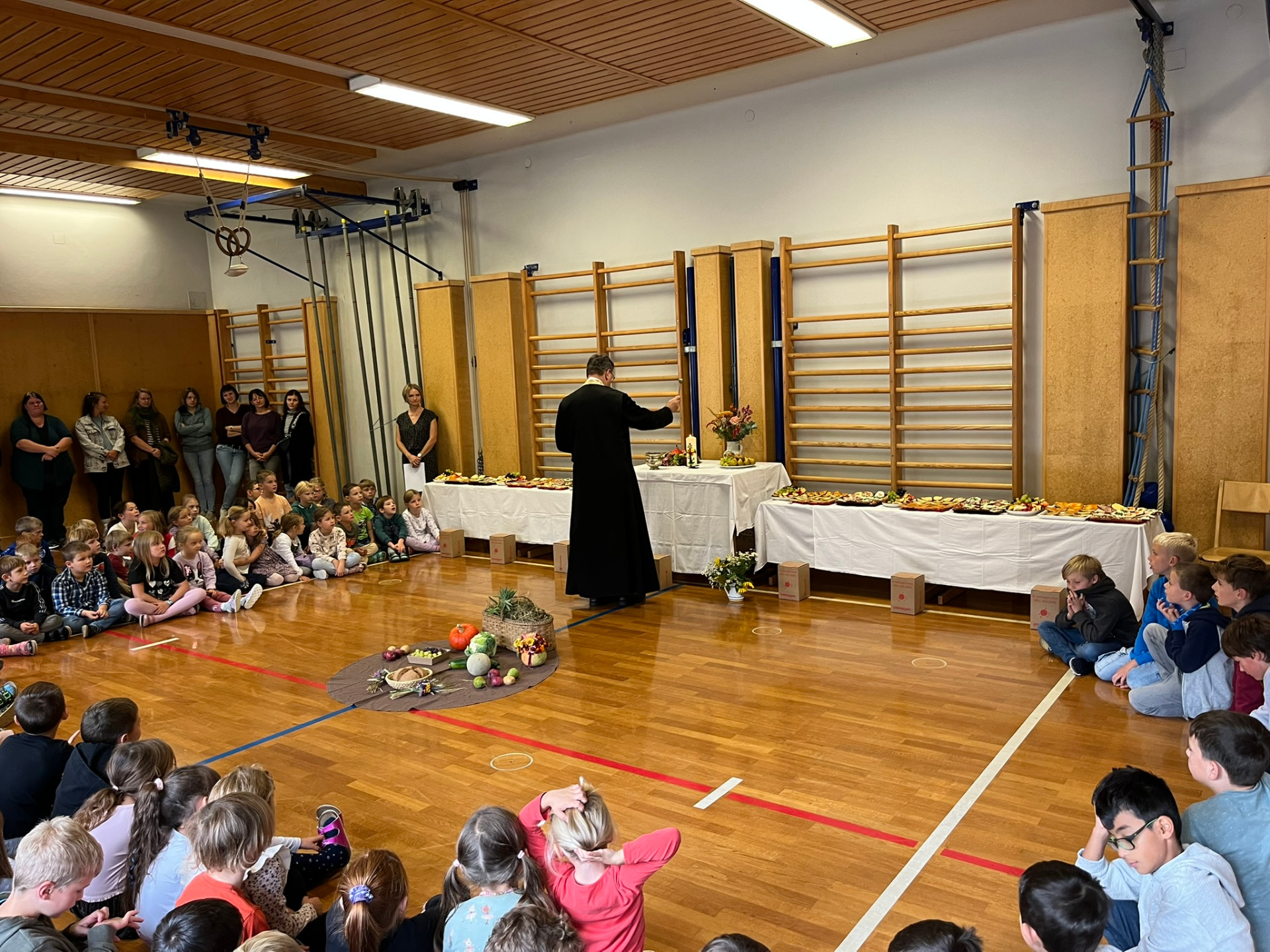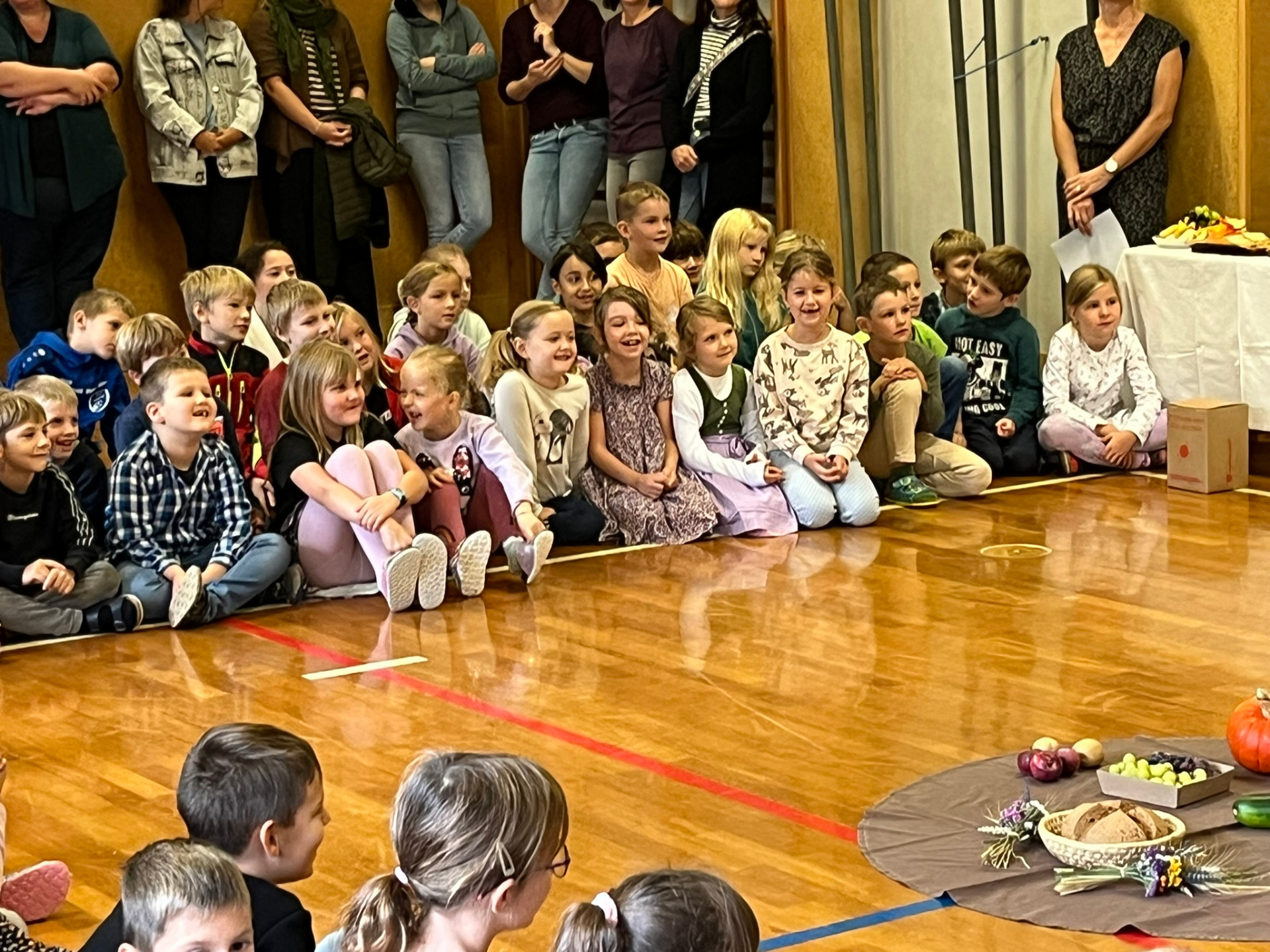 Am Montag, dem 29. September, versammelte sich unsere Schulgemeinschaft im Turnsaal, um Erntedank zu feiern. Alle Klassen brachten Herbstdeko und Nahrungsmittel für die Feier mit. Gemeinsam mit Frau Lehrerin Kristina Siegl bereiteten acht Elternteile aus allen Klassen liebevoll die leckere Erntedankjause vor.