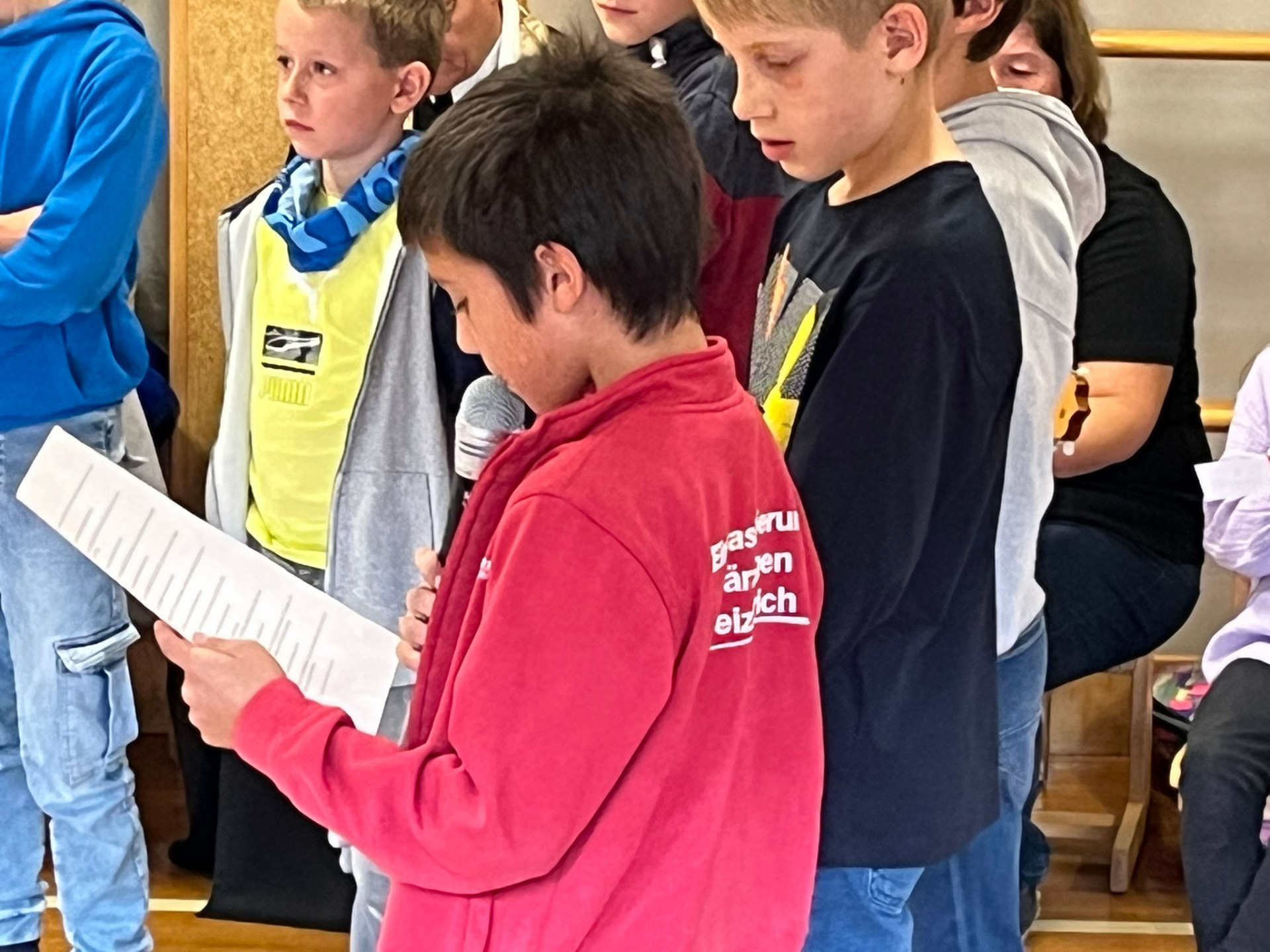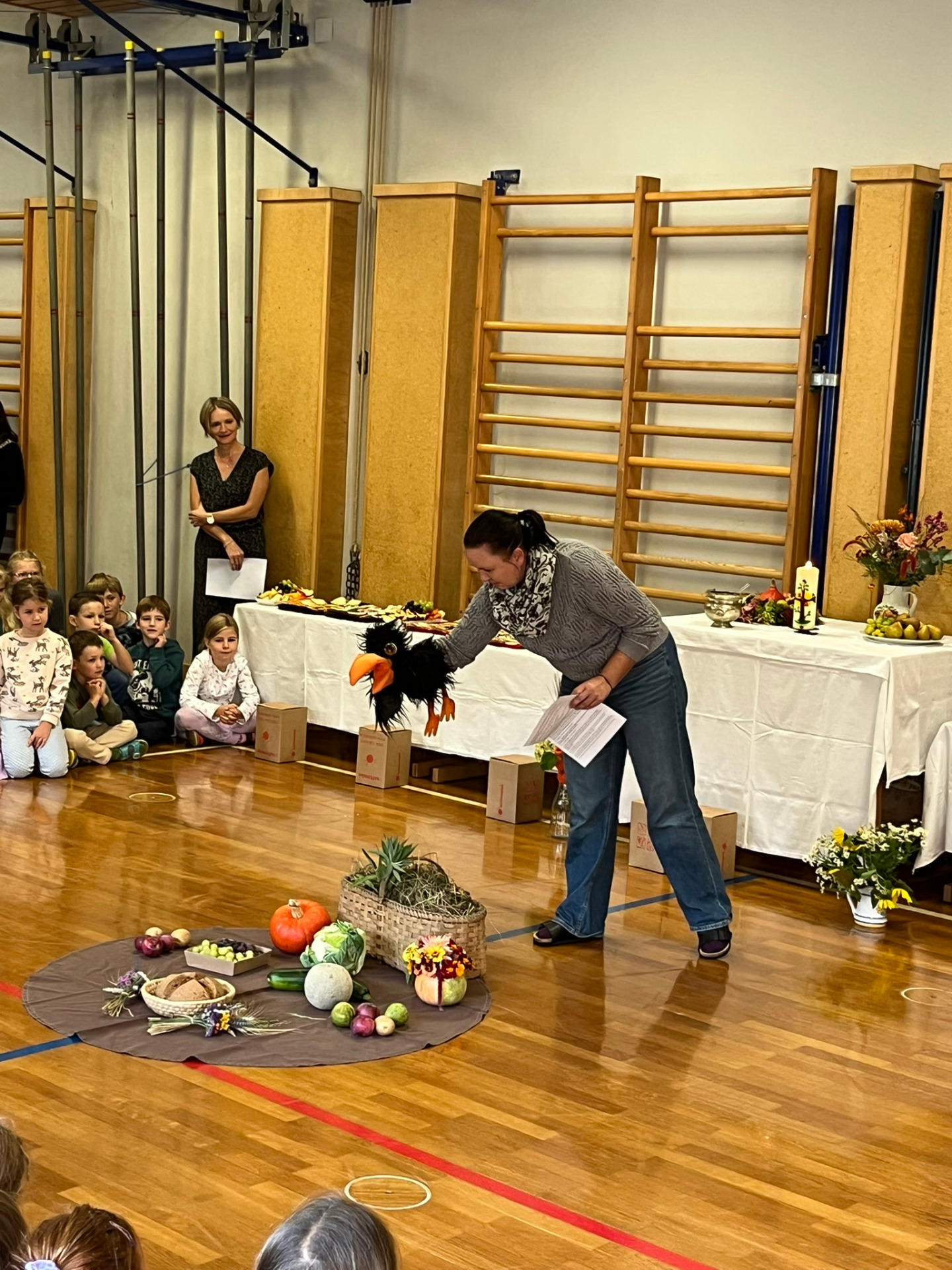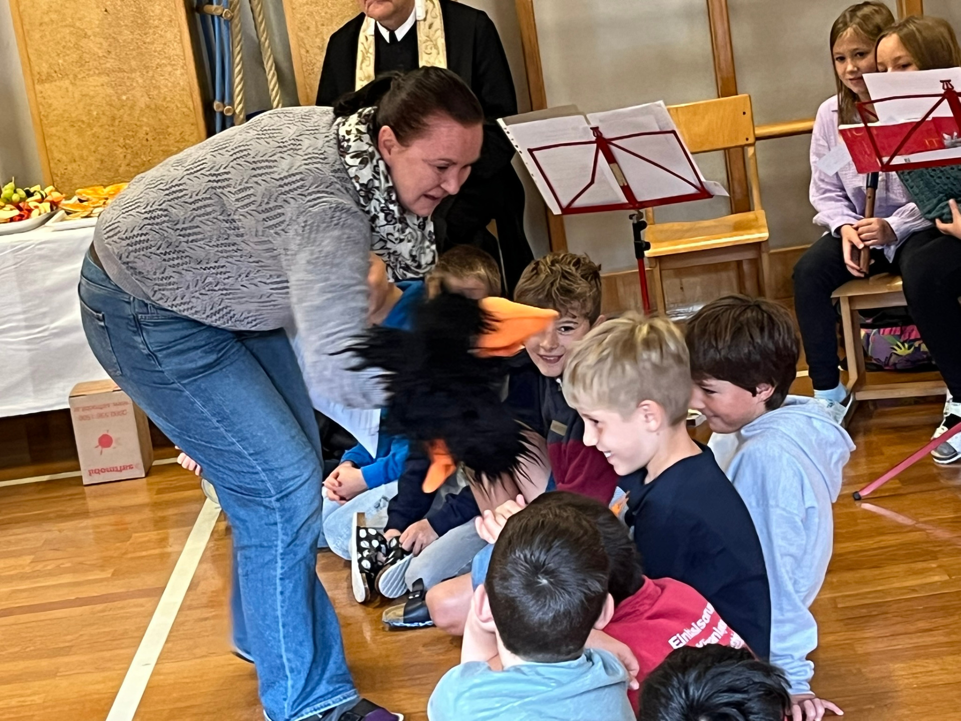 Bei der Feier – vorbereitet von Religionslehrerin Gertraud Handsteiner – freuten wir uns besonders über den Besuch einer Krähe, die Gott zuerst für gar nichts Danke sagen wollte – es gab ja schließlich keine Erdnüsse, ihre Lieblingsspeise! Doch je mehr sie nachdachte, umso mehr Gründe fielen ihr zum Danken ein: Ihre schönen Federn, die saftigen Weintrauben, dass sie fliegen kann …