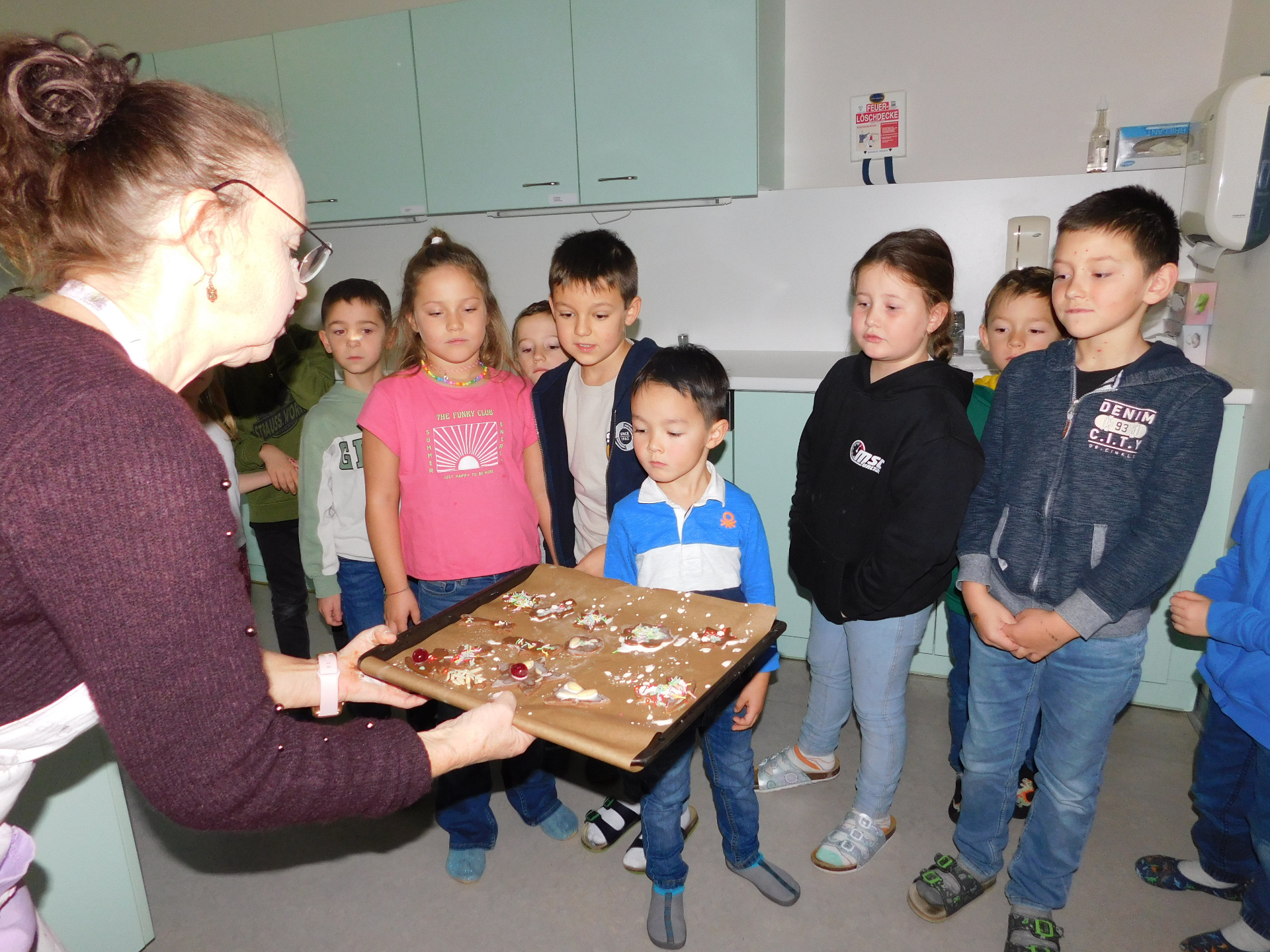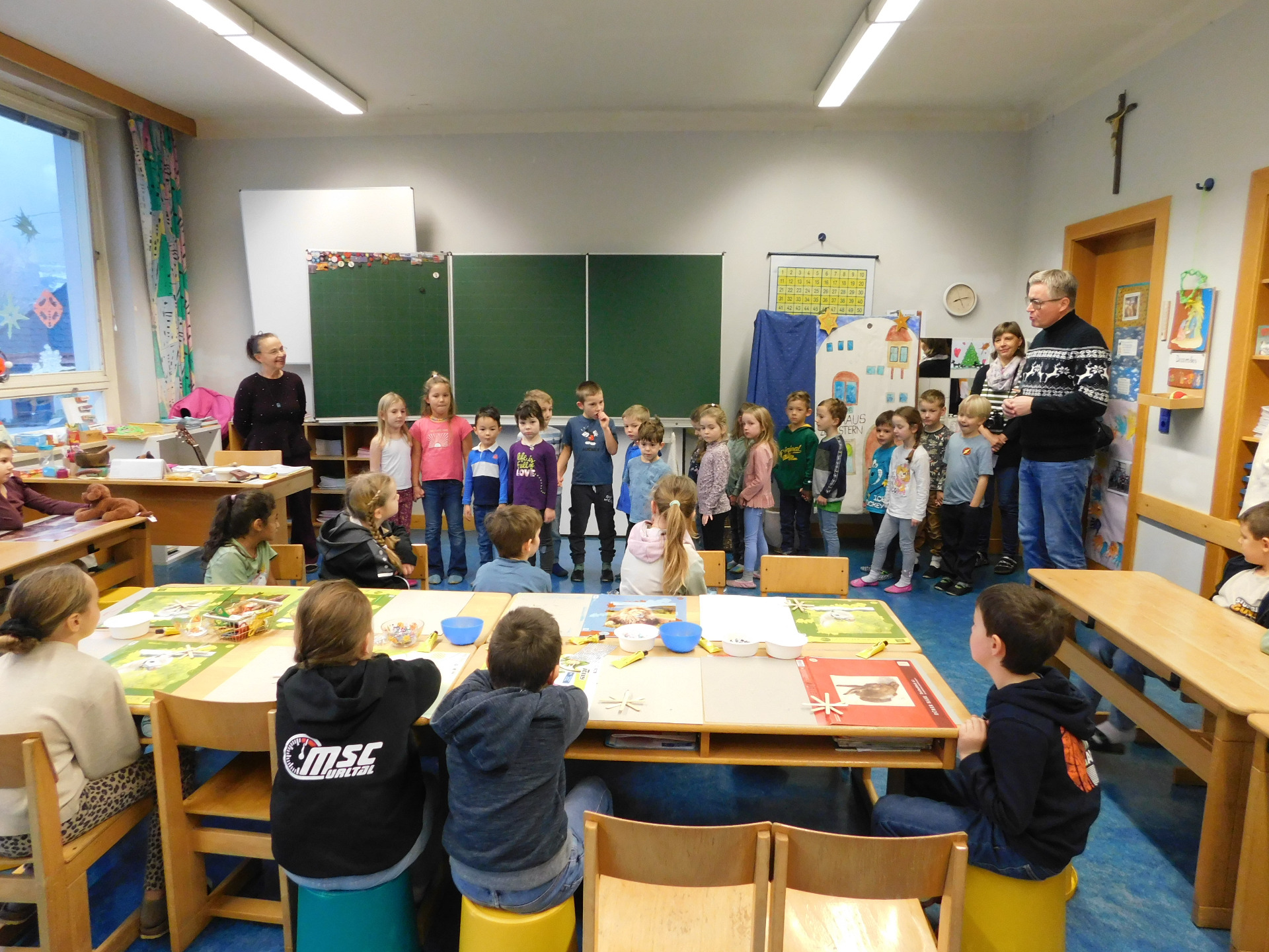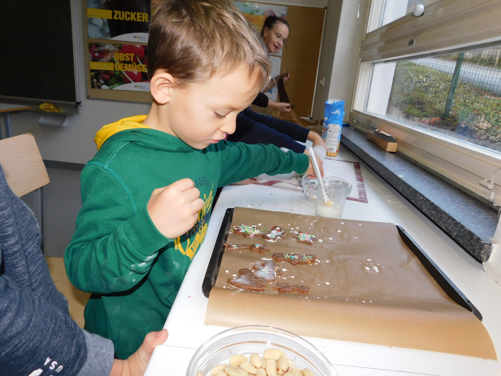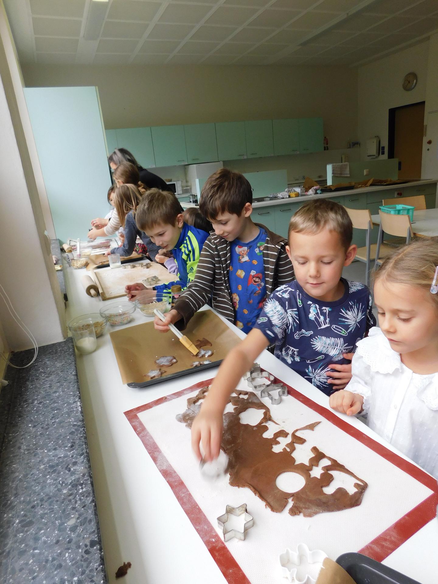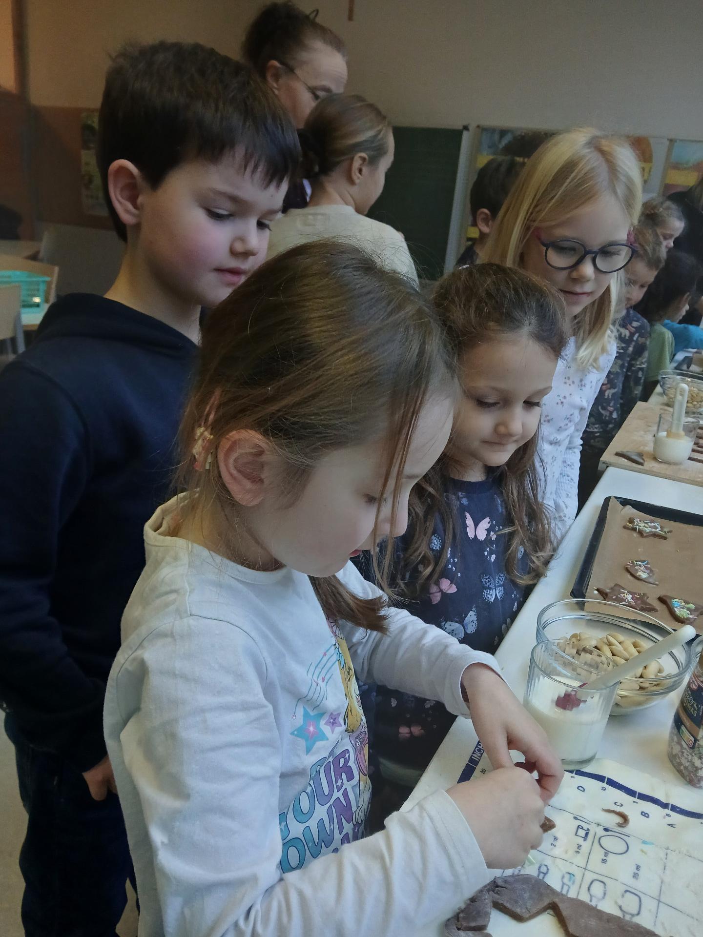 Die Schulanfängerkinder unserer Kindergärten kamen im Rahmen unserer Kooperation in zwei Besuchergruppen aufgeteilt zum Adventtreffen zu uns in die Schule. Die Schülerinnen und Schüler unserer 2. Klassen hatten mit ihren Lehrerinnen und dem Herrn Direktor abwechslungsreiche vorweihnachtliche Stationen vorbereitet: backen in der Küche, gemeinsames Basteln und eine Vorlesestation. Auch eine gemeinsame Jause stand auf dem Programm.